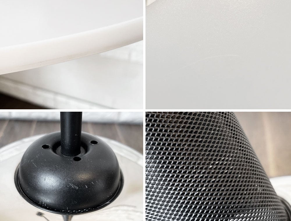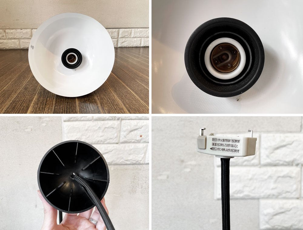 使用に伴い、アクリルシェードには光の加減で見える程度の小傷や薄っすらとした汚れが見受けられます。また、スチールシェードには細かな擦れ傷や縁の削れ、パンチングメッシュ部分のペイントロスやくすみが生じているとともに、内側の塗装剥がれに伴い若干の錆が確認できます。なお、シーリングカバーは内部の爪をコードに密着させることで固定がされますが、やや緩みがございますので、予めご承知おきくださいませ。その他、著しく美観を損ねる箇所やご使用に支障となるダメージはございません。これからもまだまだ実用頂けるコンディションを保っております。