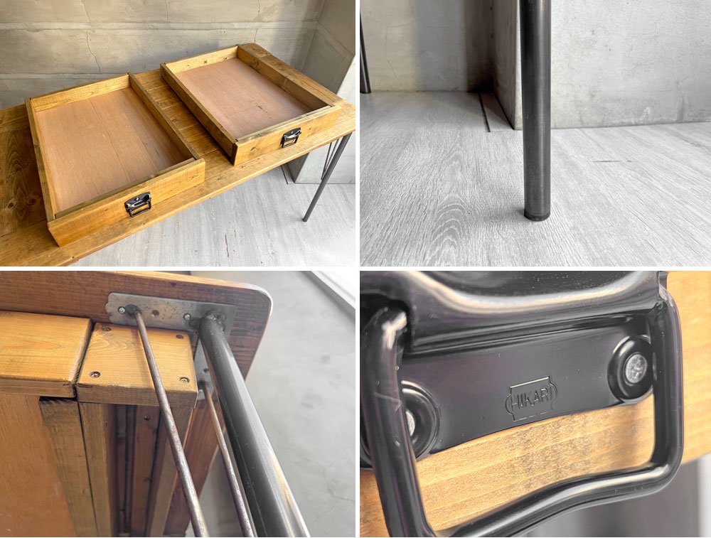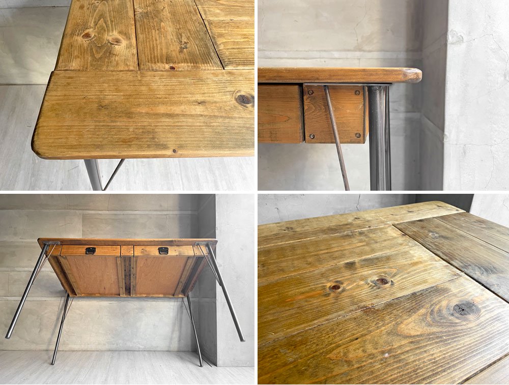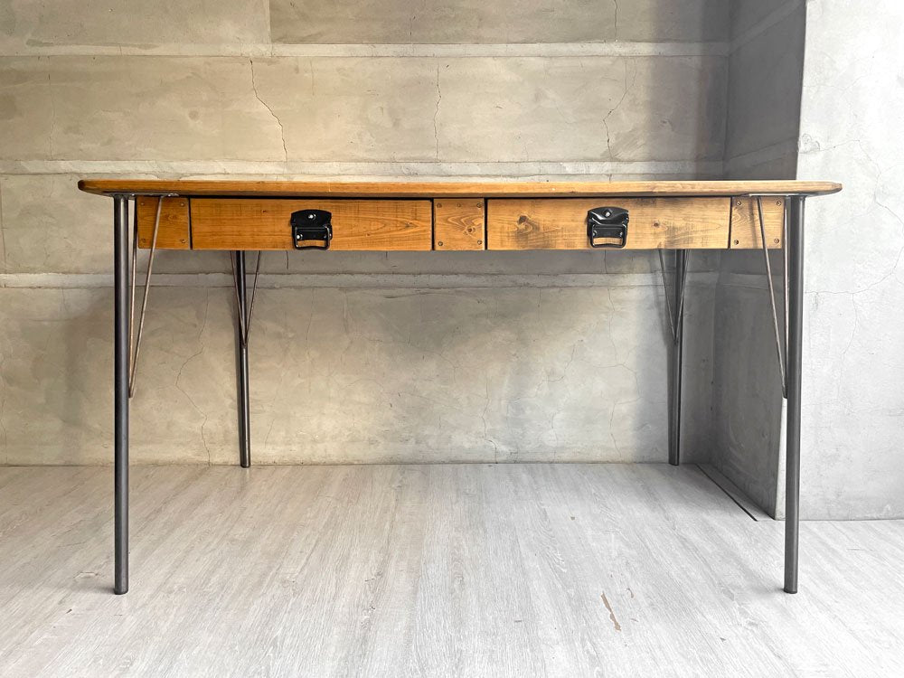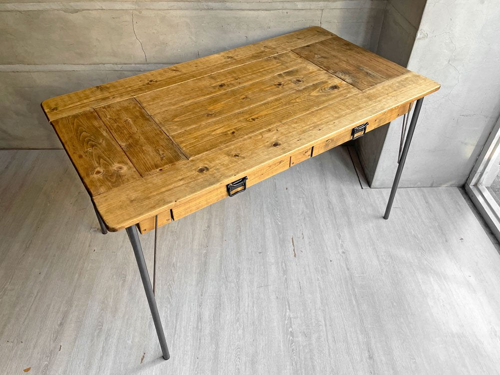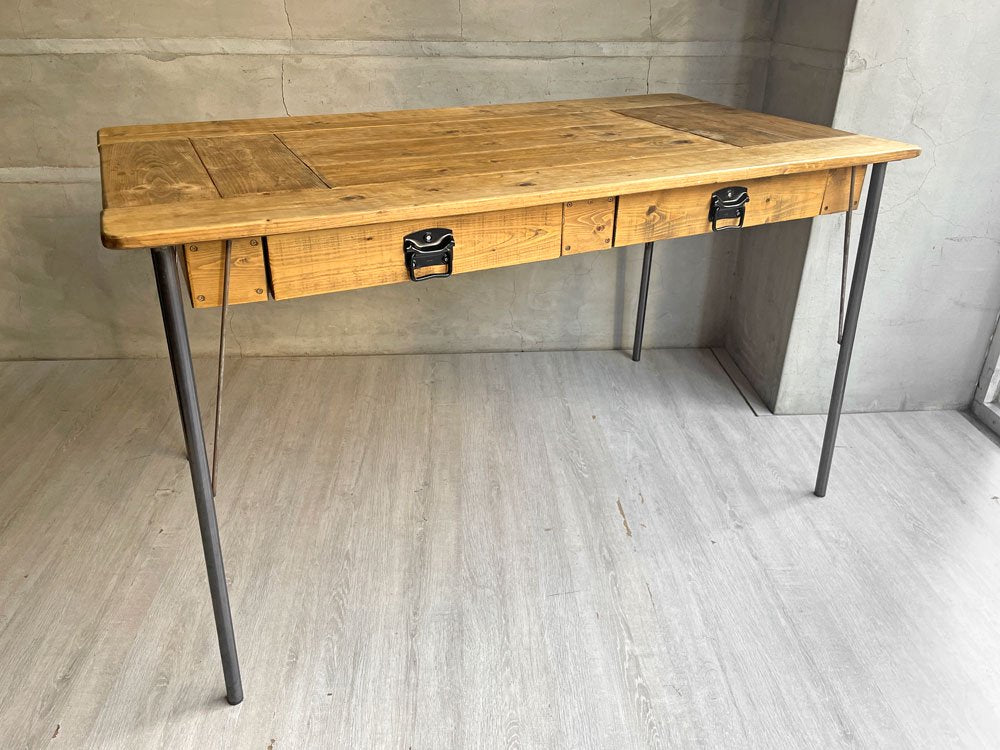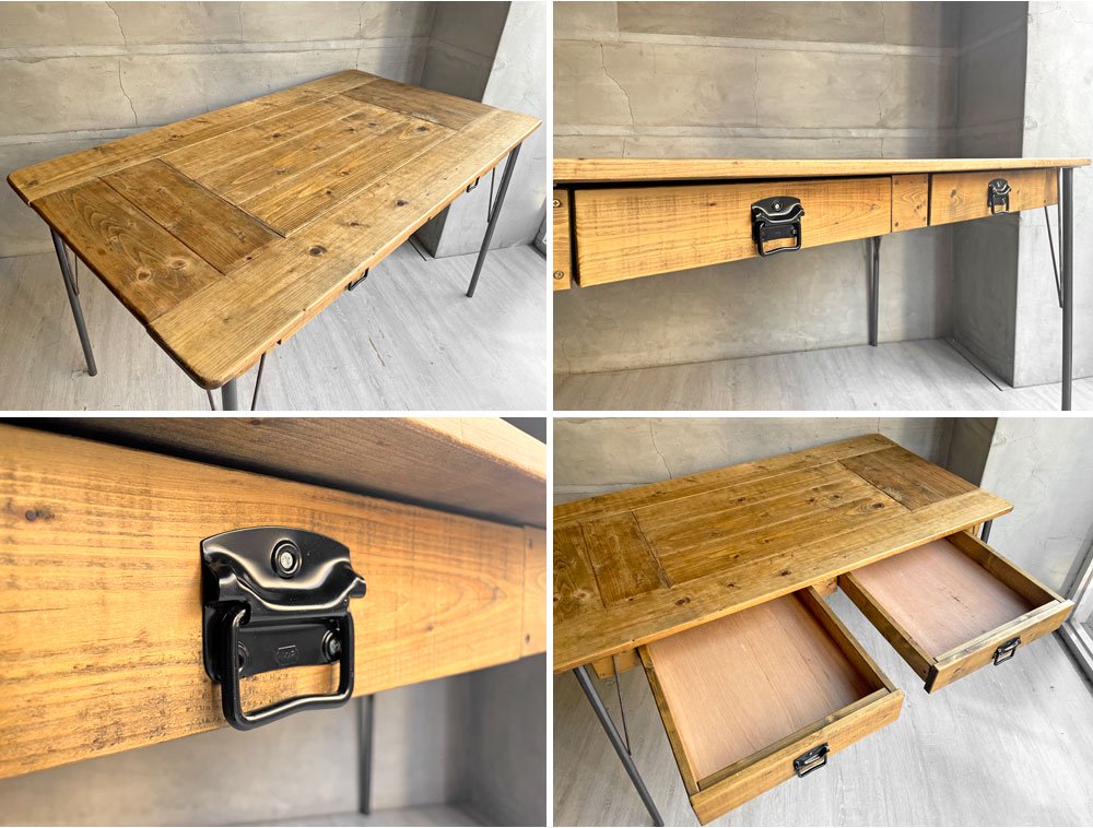ビンテージスタイル パイン材×鉄脚 ダイニングテーブル ワークテーブル デスク 引き出し2杯 インダストリアル ♪
