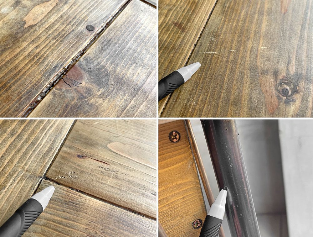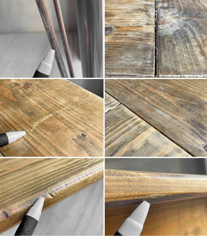 使用に伴い、天板表面には擦れや打痕、色移り、接合部に若干の隙間が見受けられます。フレームには擦れやくすみ、僅かな錆が確認できます。また構造上若干のグラつきがございますが、通常使用に支障を来すものではございません。その他大きなダメージは無くこれからも安心して実用頂けるコンディションを保っております。
