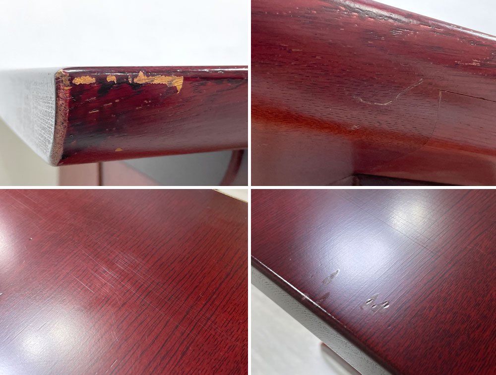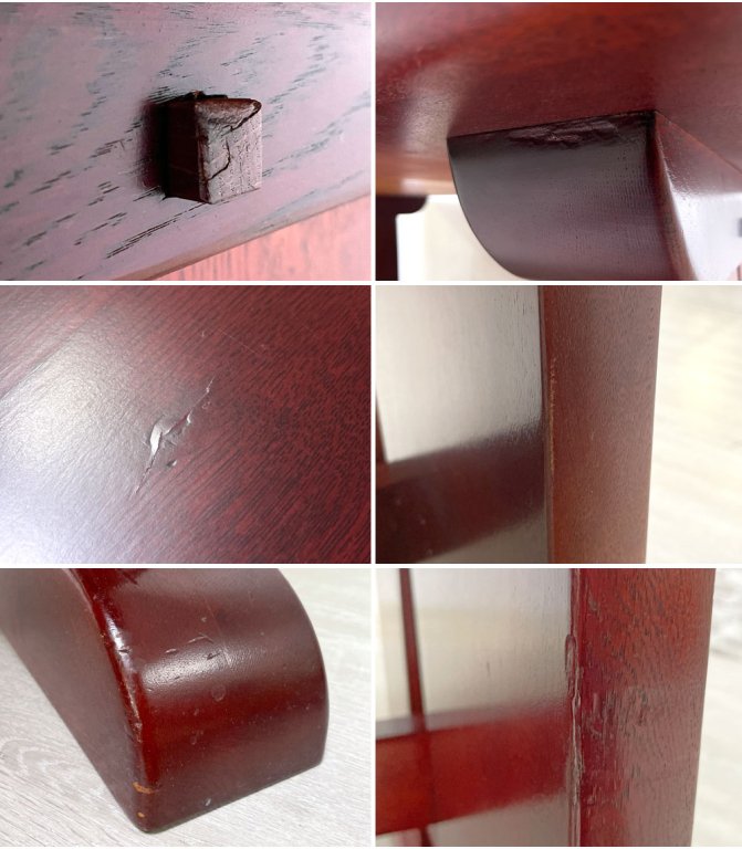 使用に伴い、軽微な擦れや傷、打痕、落としきれない汚れが散見され、角や縁を中心に色抜けや塗装の剥がれが所々に見られますが、いずれも目立つ程のものではございません。その他グラつきやガタつき等のダメージも見られず、これからも実用頂けるコンディションを保っております。