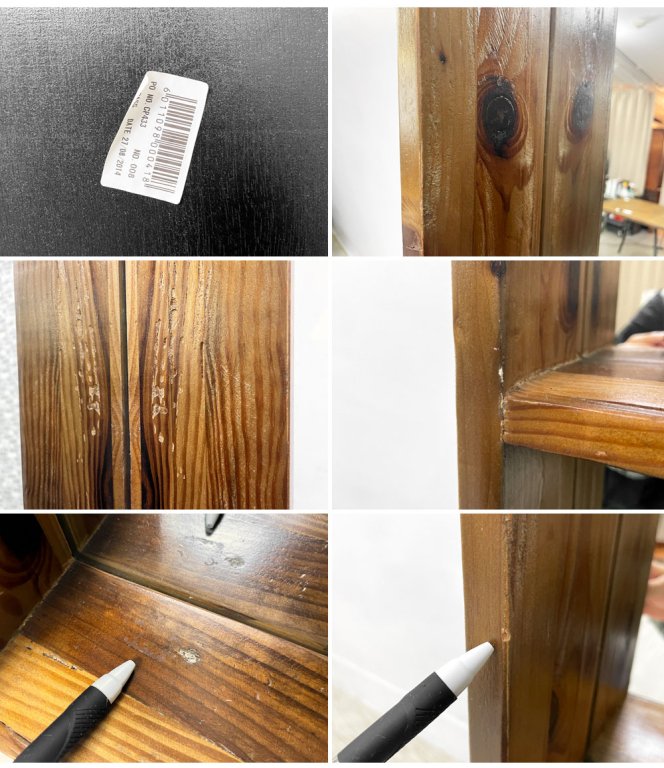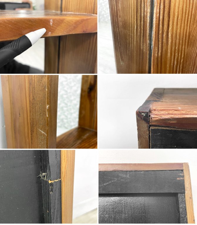 古材特有の傷やスレ、割れや欠け、汚れなどがございますが、製造時からの仕様となります。その他、若干の傷やスレなどがございますが、鏡のヒビや割れ等使用上問題となる大きなダメージはございません。これからも実用頂けるコンディションを保っております。