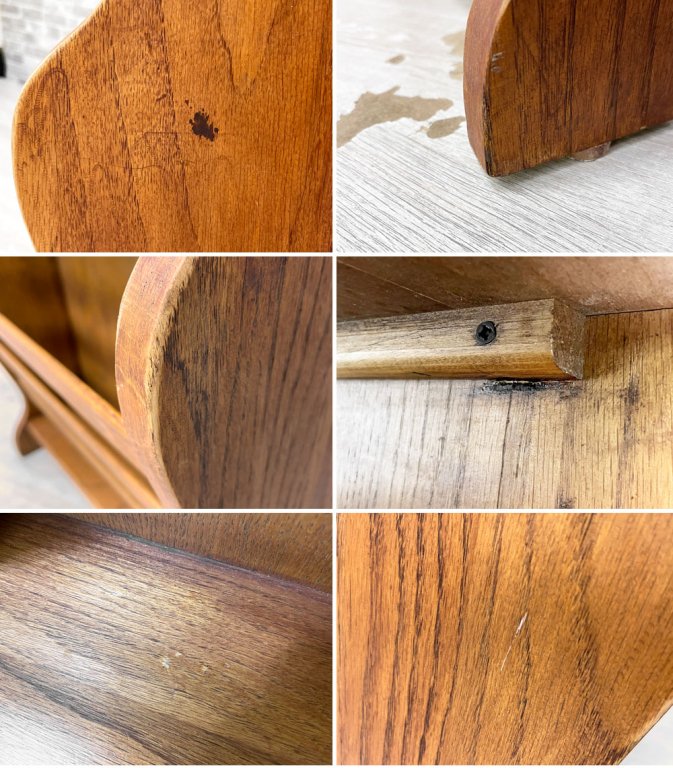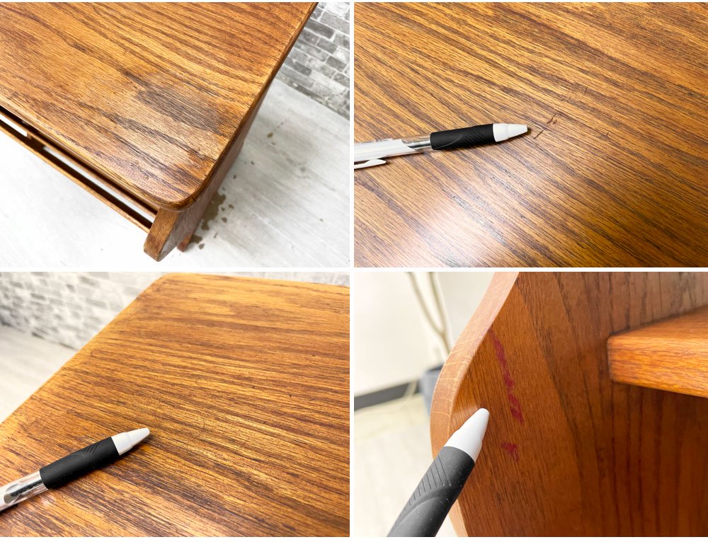こちらはビンテージのお品物になります。使用や経年に伴い、天板には擦れや線傷、輪染みがございます。その他、ペンキ跡や落としきれない汚れなどがございますがその他使用上問題となる大きなダメージはございません。これからも実用していただけるコンディションを保っております。