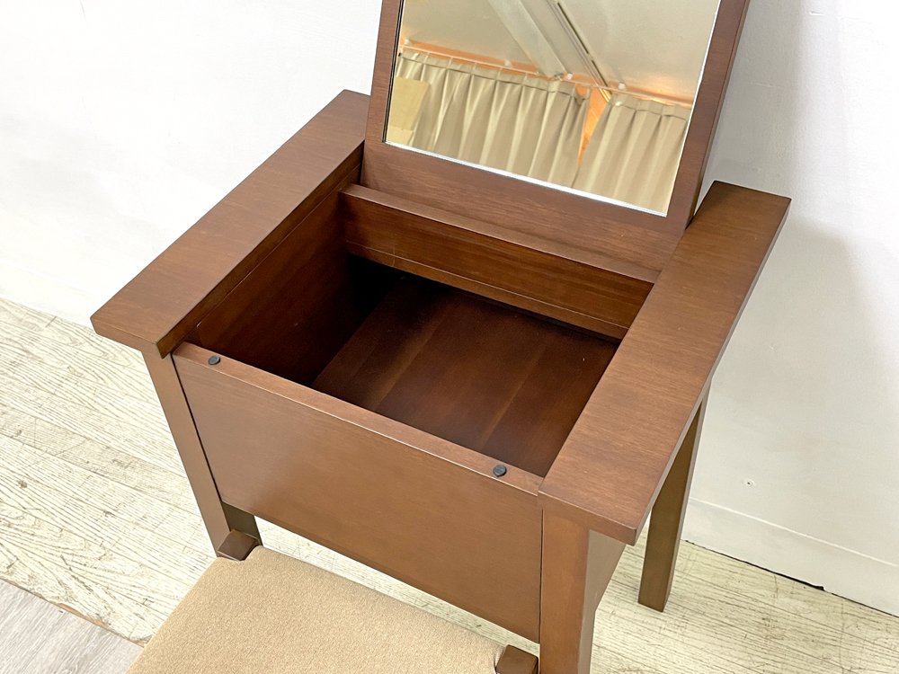 落ち着いたブラウン色塗装のバーチ材を使用したウッドフレーム。天板を開くと鏡が現れる構造で、内部はお化粧道具等の収納スペースとして活用頂けます。鏡を使用しない時はちょっとした書き物やPCワークに使えるデスクとして。昨今の在宅ワークに伴うデスク需要にも応えられます。
