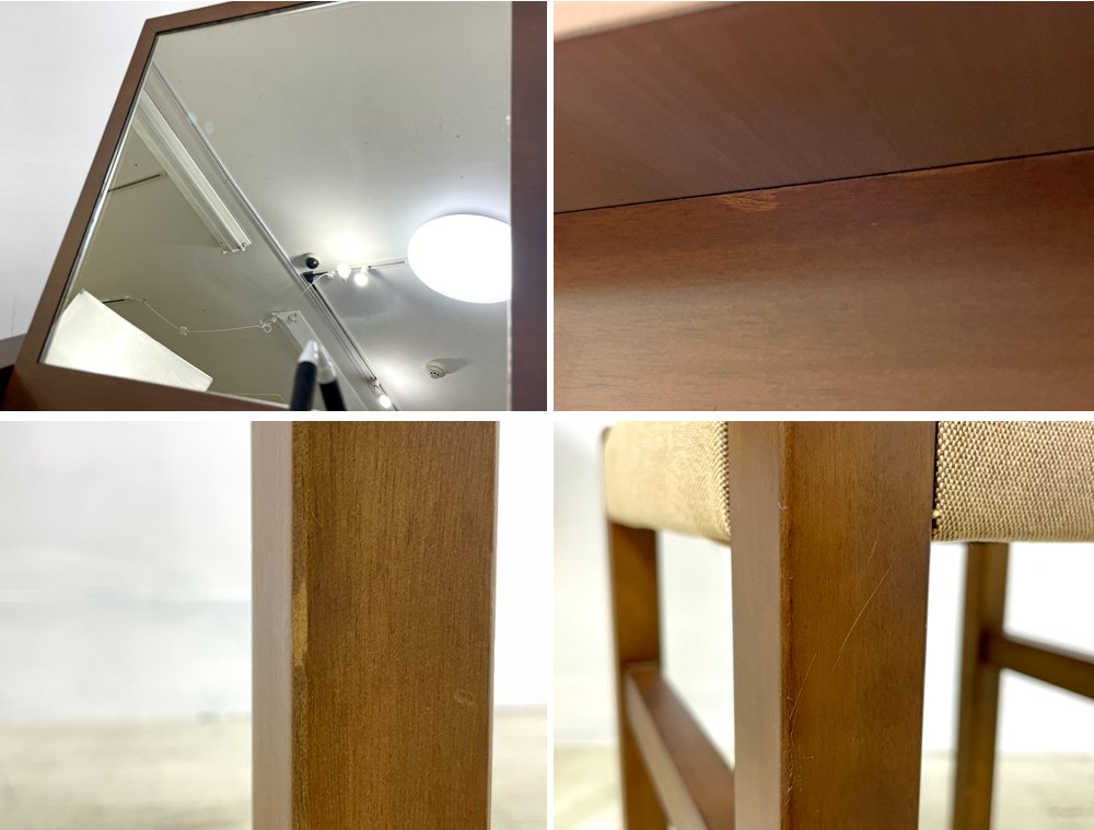 全体に軽微な擦れ、凹みが見受けられます。チェアの座面は使用による若干のヘタリがあり、ファブリックの裏面には仕様に伴う縫製の解れが見受けられます。