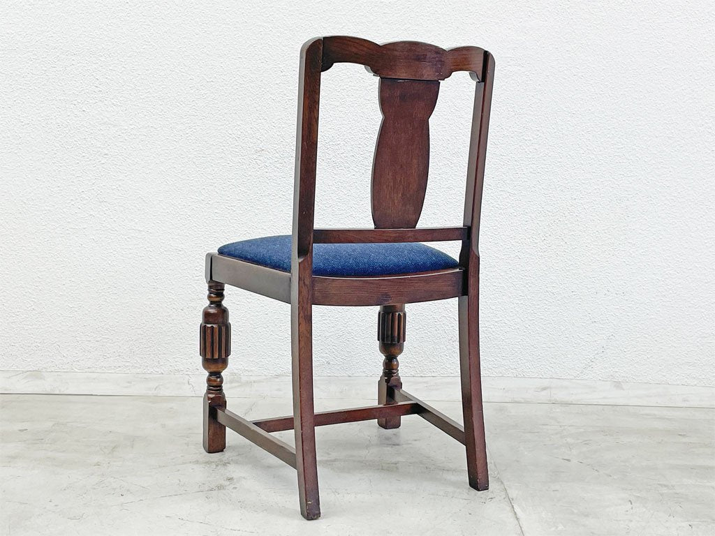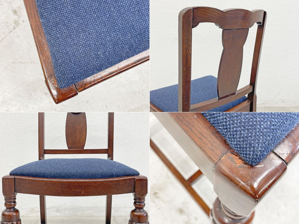 UKビンテージ Vintage ダイニングチェア オーク材 シート張替え ネイビー系 バルボスレッグ 彫刻装飾 英国アンティーク B 〓