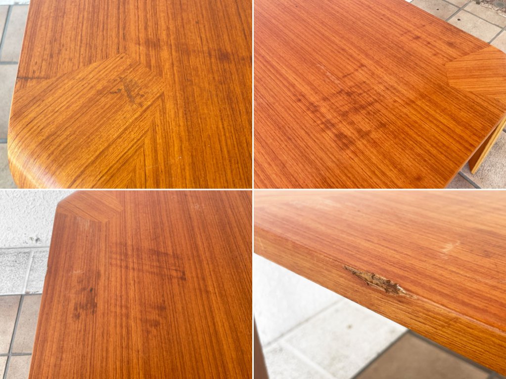 こちらはビンテージ品です。天板には色むら、線傷、輪染み、打痕やそれに伴う突板の剥がれ等経年なりのダメージが見受けられますが、著しく美観を損ねるものではございません。その他ガタツキや割れ等使用上問題となるダメージは見受けられず、これからも気持ち良くお使い頂けるコンディションを保っております。