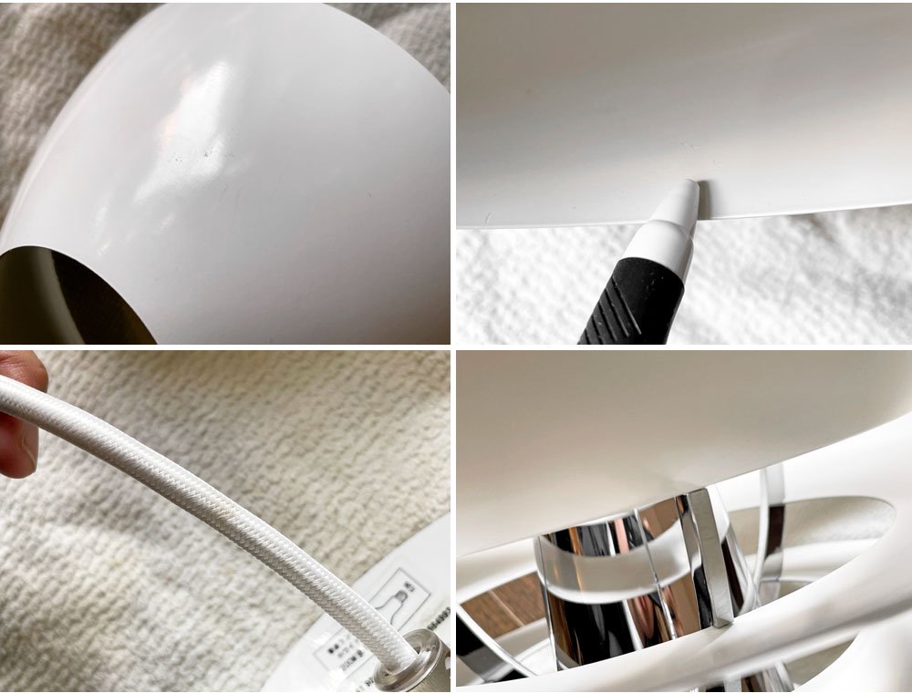 使用に伴い、シェードには若干の傷や擦れなどが見受けられるとともに、若干の歪みが生じております。また、コードの僅かな汚れ、金属部に微細なくすみや錆などがございますが、ご使用上問題となる大きなダメージはございません。これからも安心して実用頂けるコンディションを保っております。