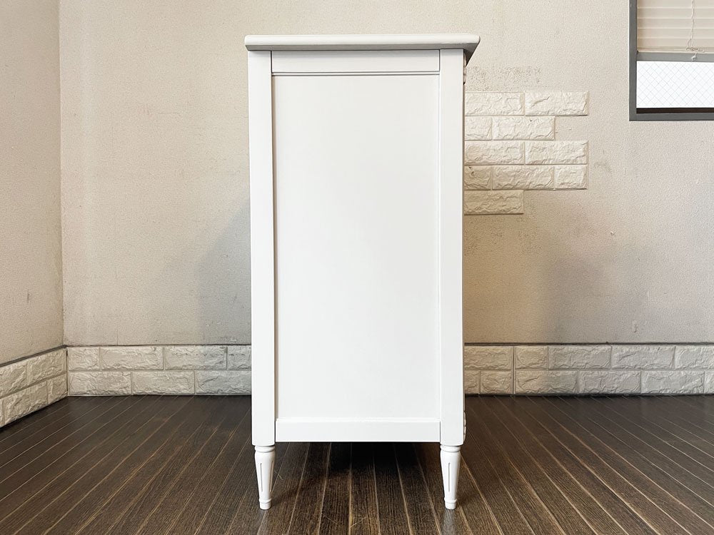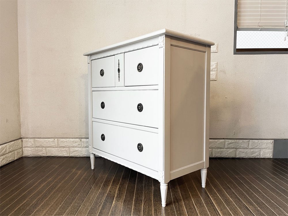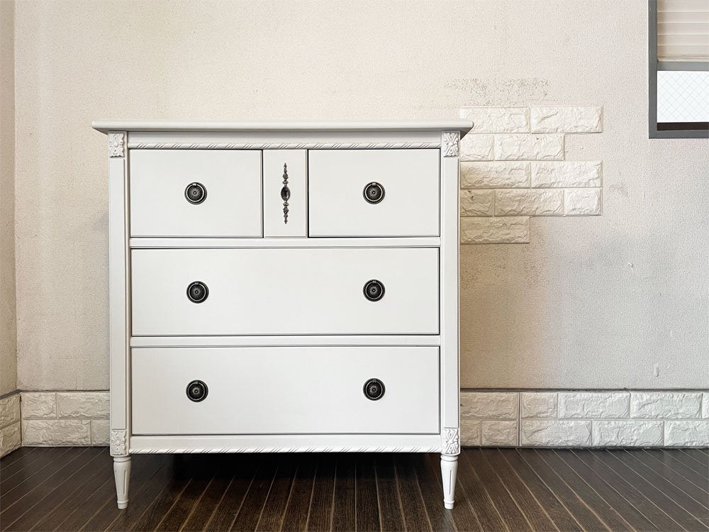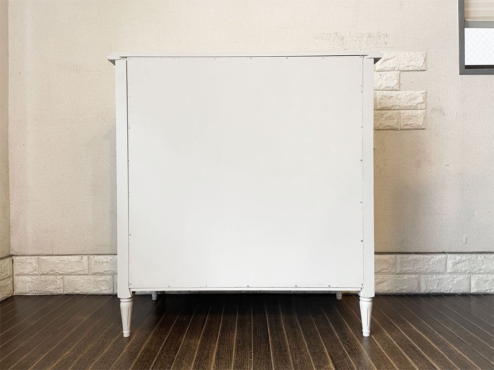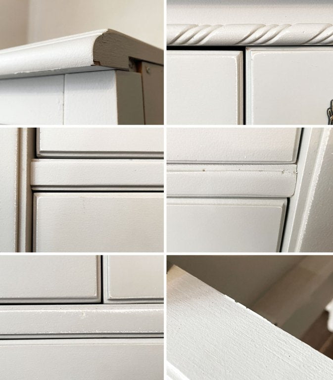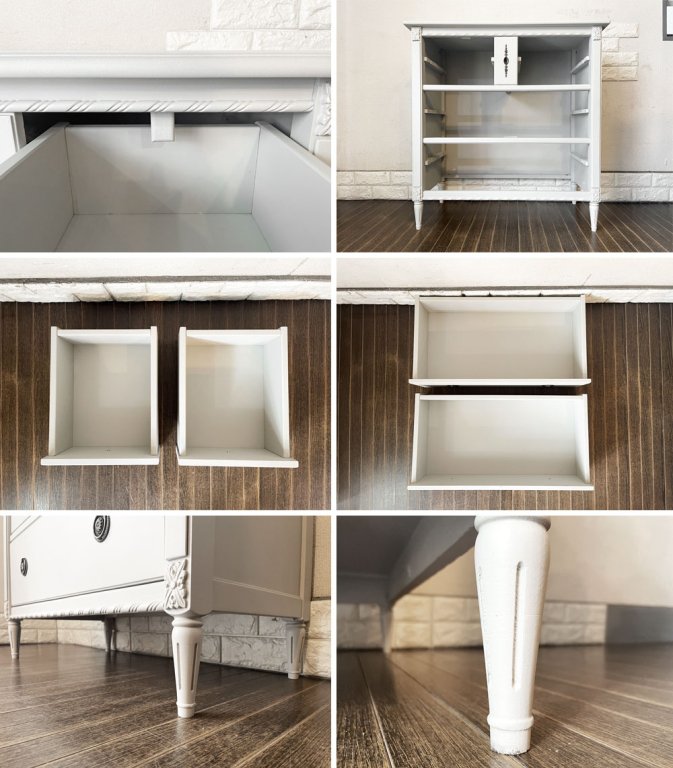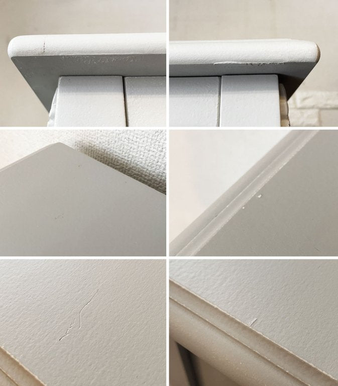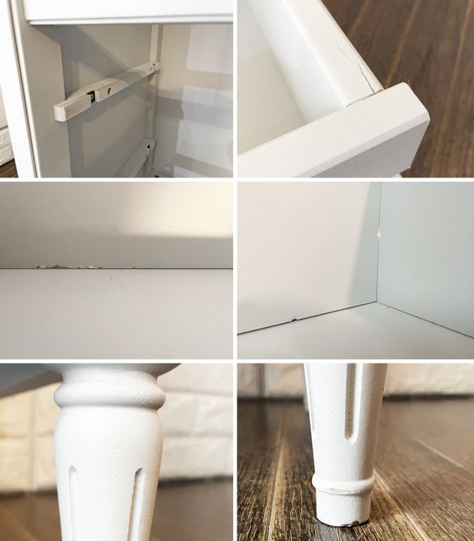 こちらは、アンティーク調のお品物です。全体にペイントロスや擦れ、傷、縁の欠けや削れ、黒ずみなどの取り切れない汚れ等はございますが、風合いとしてお楽しみ頂ける程度かと思われます。抽斗の開閉もスムーズで、ご使用に支障となる目立ったダメージはございません。今後も安心して実用頂けるコンディションを保っております。