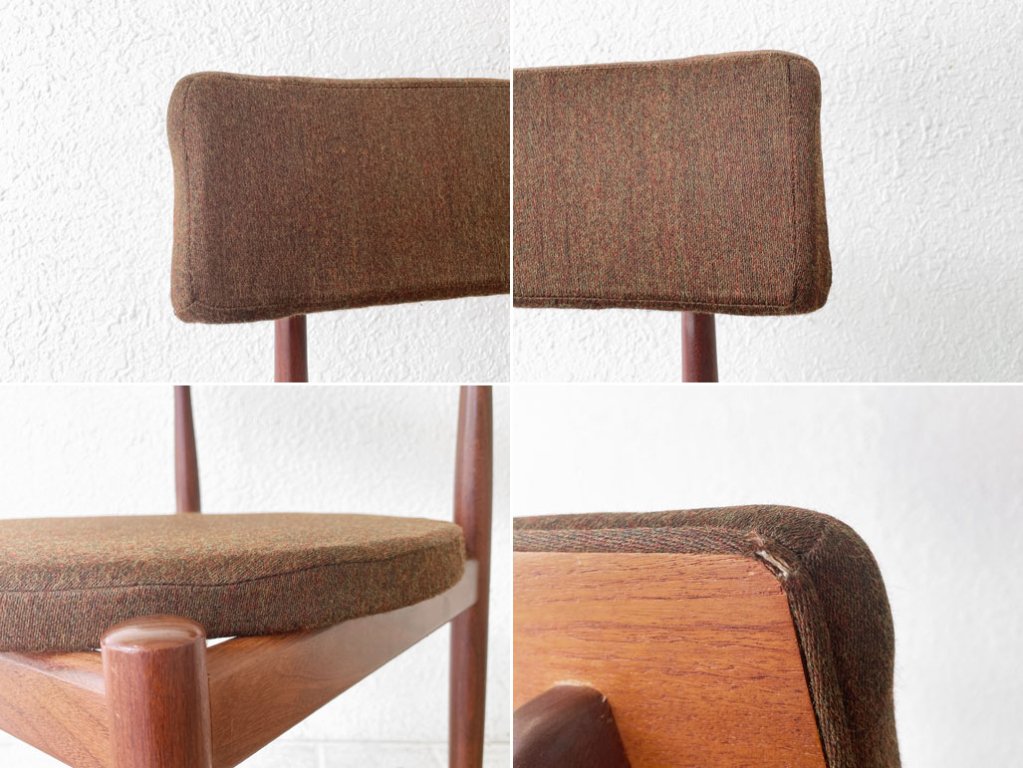 こちらはビンテージ品です。フレームや背もたれ裏の擦れ、打痕や細かな削れ、ファブリックの毛羽立ちや僅かなほつれ等が見られますが、大きく美観を損ねるものではございません。内部ウレタンの偏りによる背座の若干の型崩れはございますが、こちらも目立つ程のものでは無く、座り心地に影響もございません。ウレタンは新たに詰め直しておりますが、ファブリックはオリジナルのものをそのまま使用しております。ガタツキや割れ等使用上問題となるダメージは見受けられず、これからも安心してお使い頂けるコンディションを保っております。