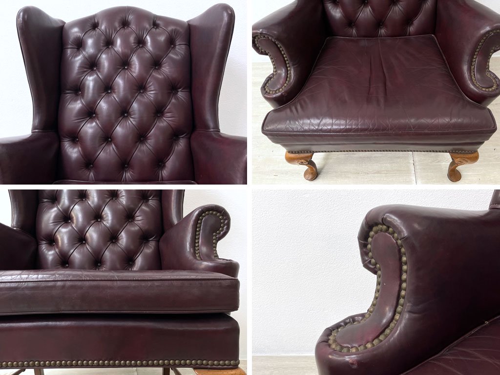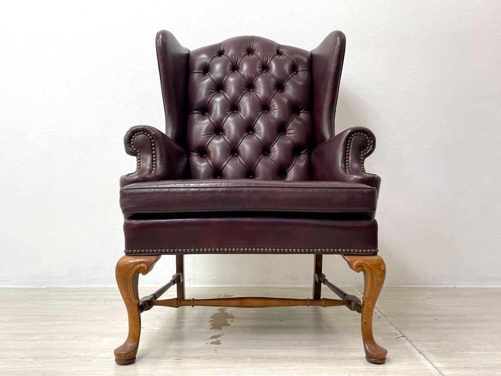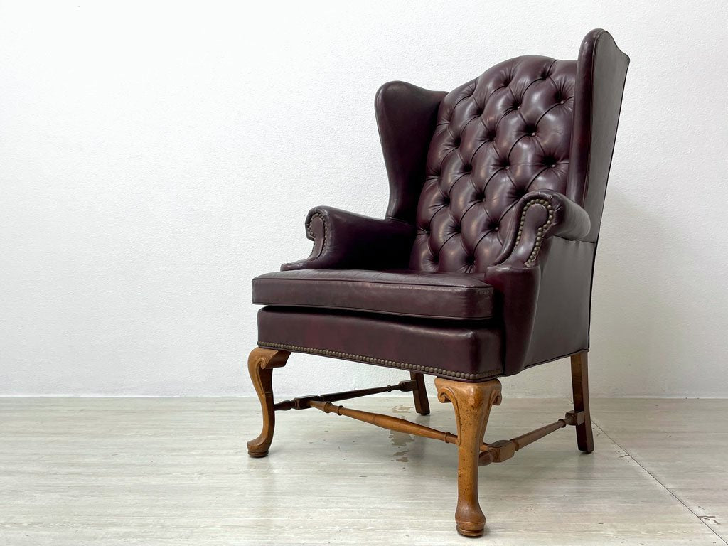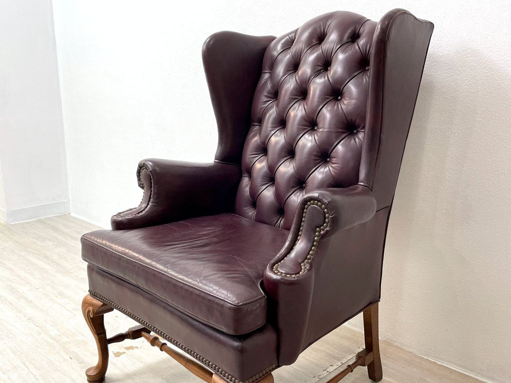 レザークラフト Leathercraft Inc. ウイングバック ボタンタフトレザー 本革 単鋲 ワインカラー クイーンアンスタイル USビンテージ 1Pソファ ●