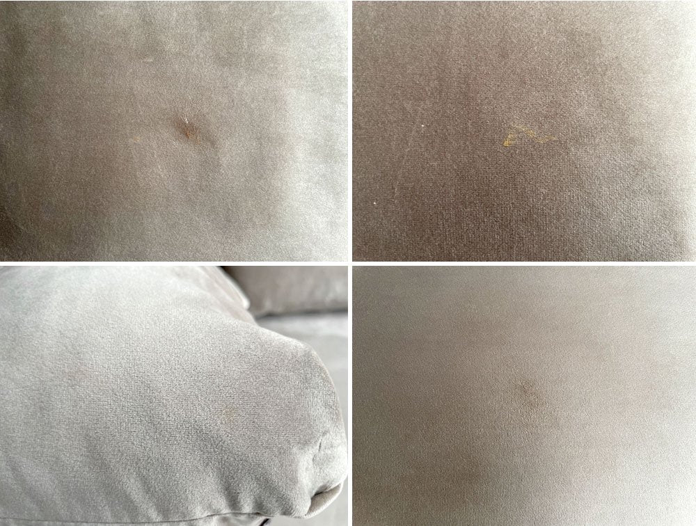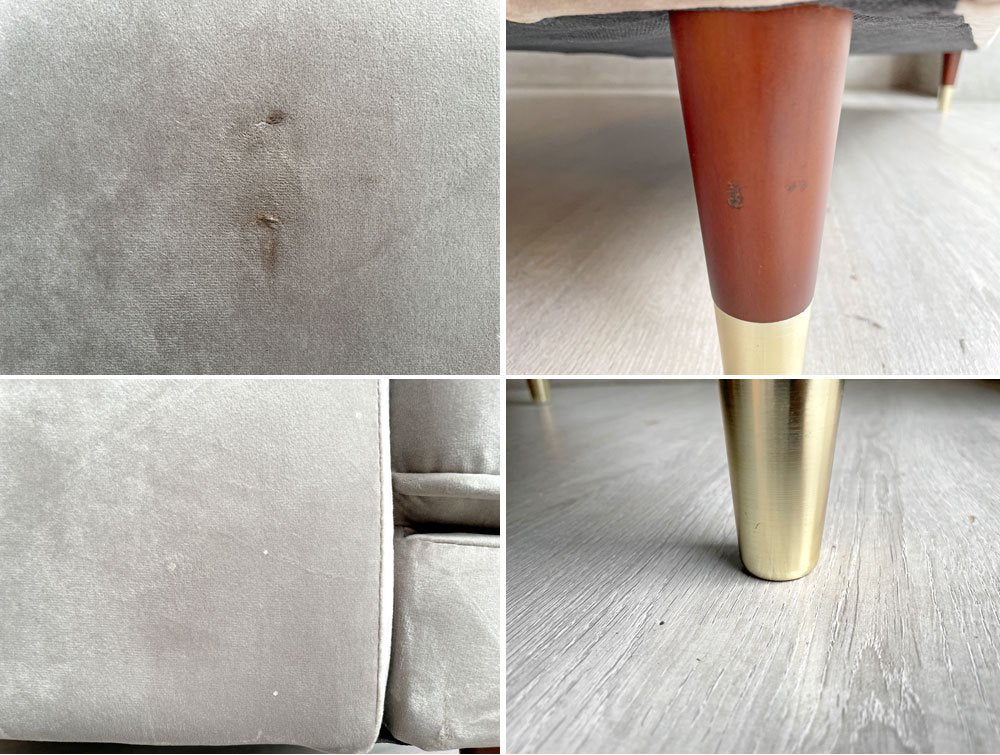 ファブリックに軽微なシミ、脚部に擦れ痕やペイントロスが見受けられます。また一箇所脚部の白いプラスチックが欠損しておりますが、ガタつきなどは無くご使用頂く上では問題ございません。その他大きなダメージは見受けられず、これからも実用頂けるコンディションを保っております。