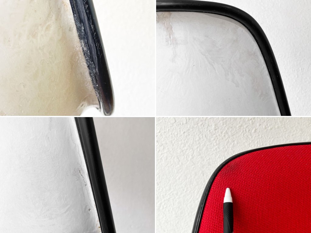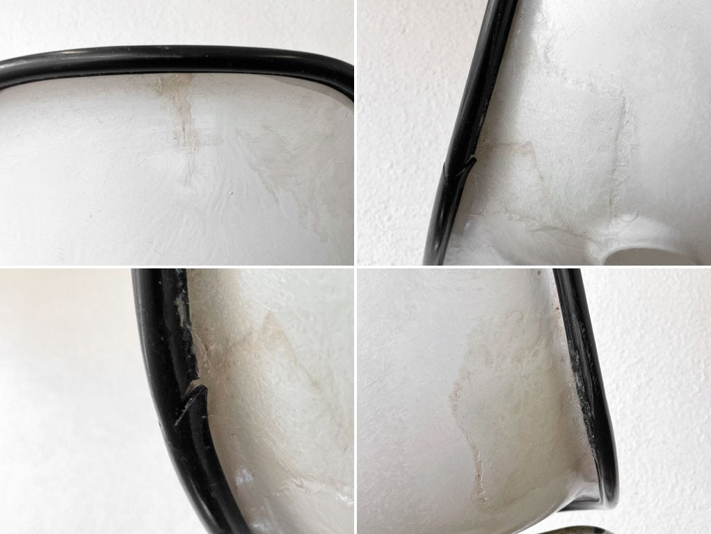こちらはビンテージ品です。シェルには擦れや若干の変色、張地に一部黒ずみ、その他パイピングの切れや脚には取りきれない錆やくすみがございますが、美観を著しく損ねるものではございません。シェルには数か所割れが見られ、当社にてグラスウールをFRPボンドで接着することにより補修、補強を行っております。現状着座は可能ですが、今後の使用の保証は出来かねますので、予めご承知おきくださいませ。