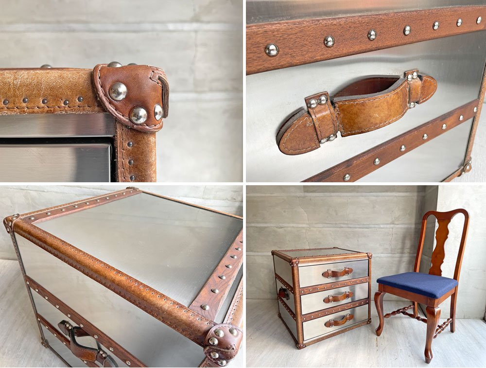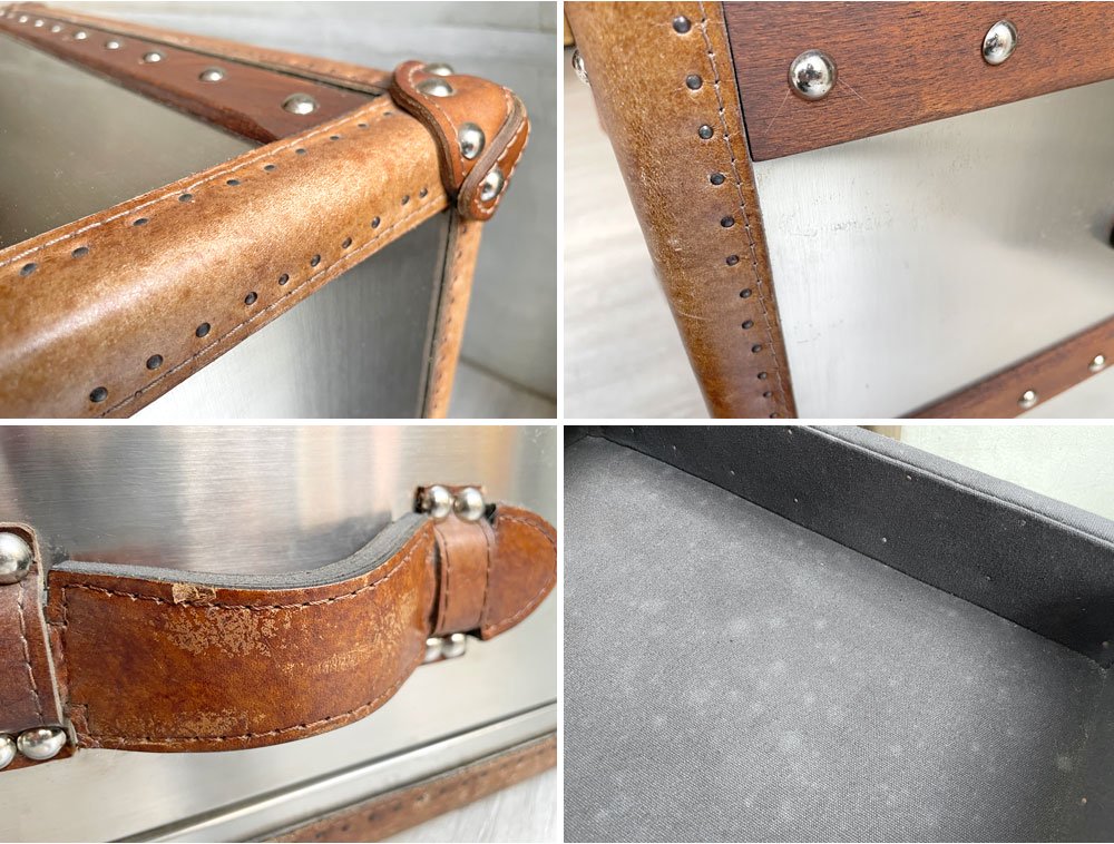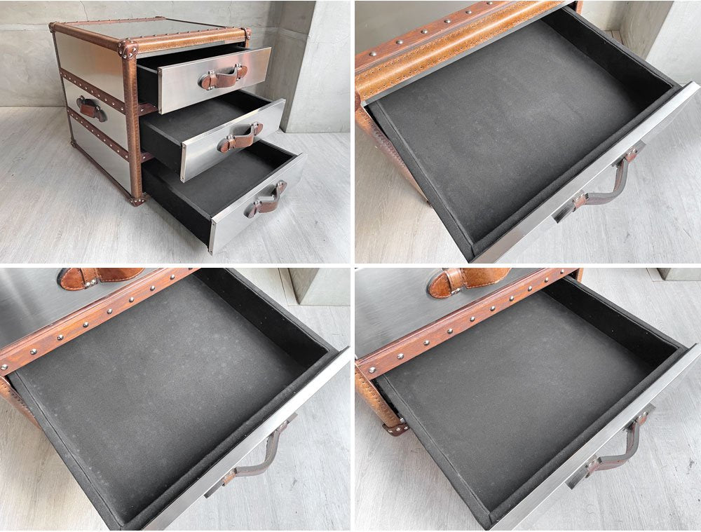 スチール部分に点錆やくすみ、木部やレザーに線傷や擦り傷が見られるほか、ドロワー内部にクリーニングで落としきれない染みがございます。