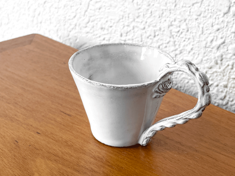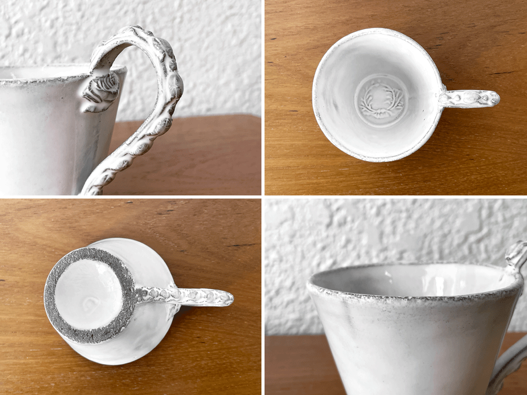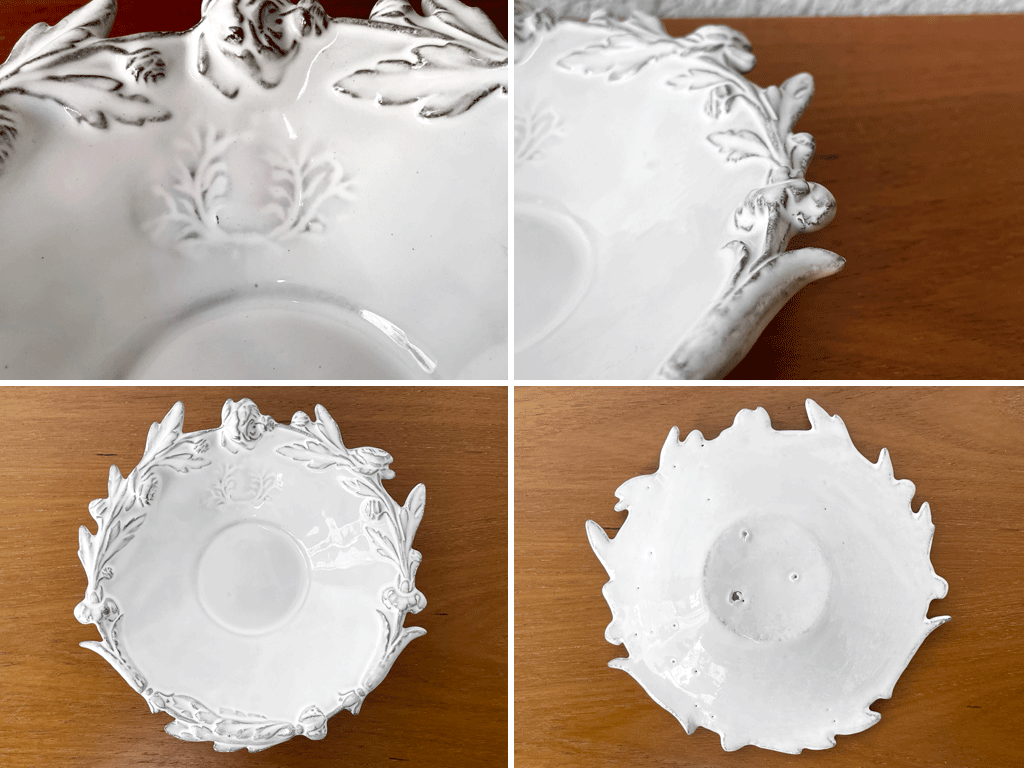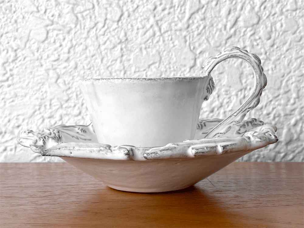 パリ郊外で取れた黒い土に白の釉薬を纏わせた美しい作品。細やかな手作業による装飾、作品全体が纏った上品な雰囲気に見惚れる逸品です。