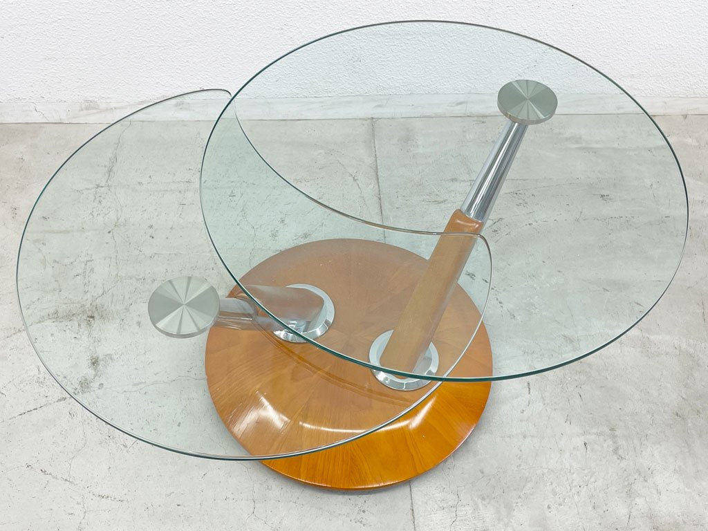 2枚のガラス天板が弧を描いて可動する機能的なテーブル。