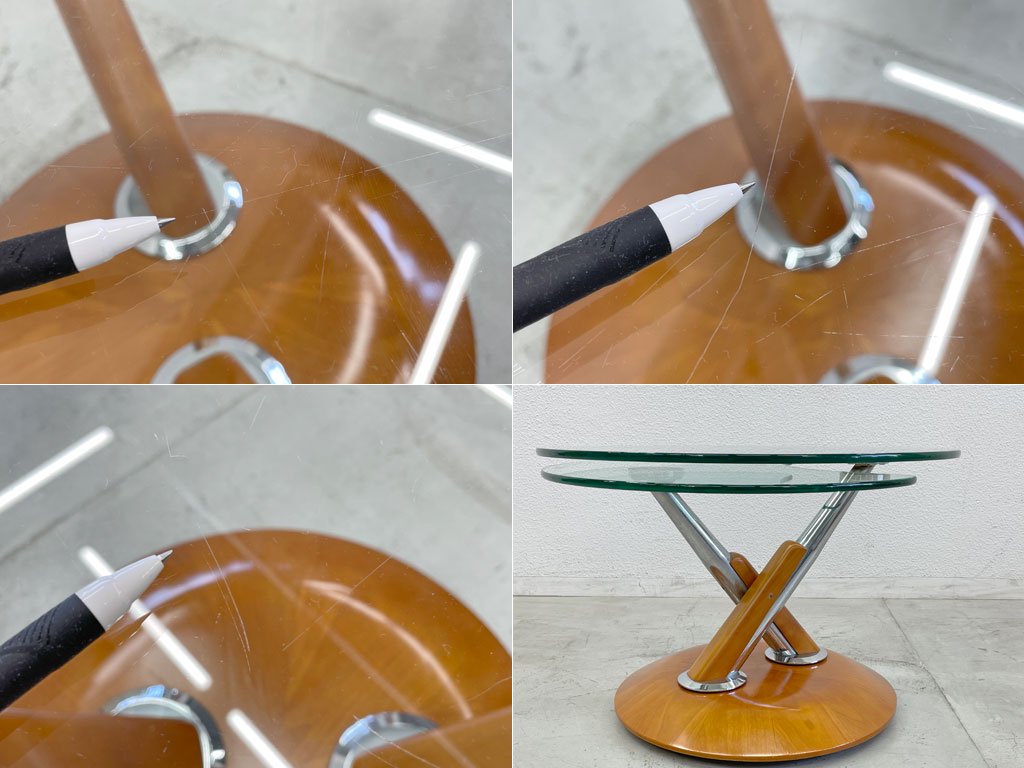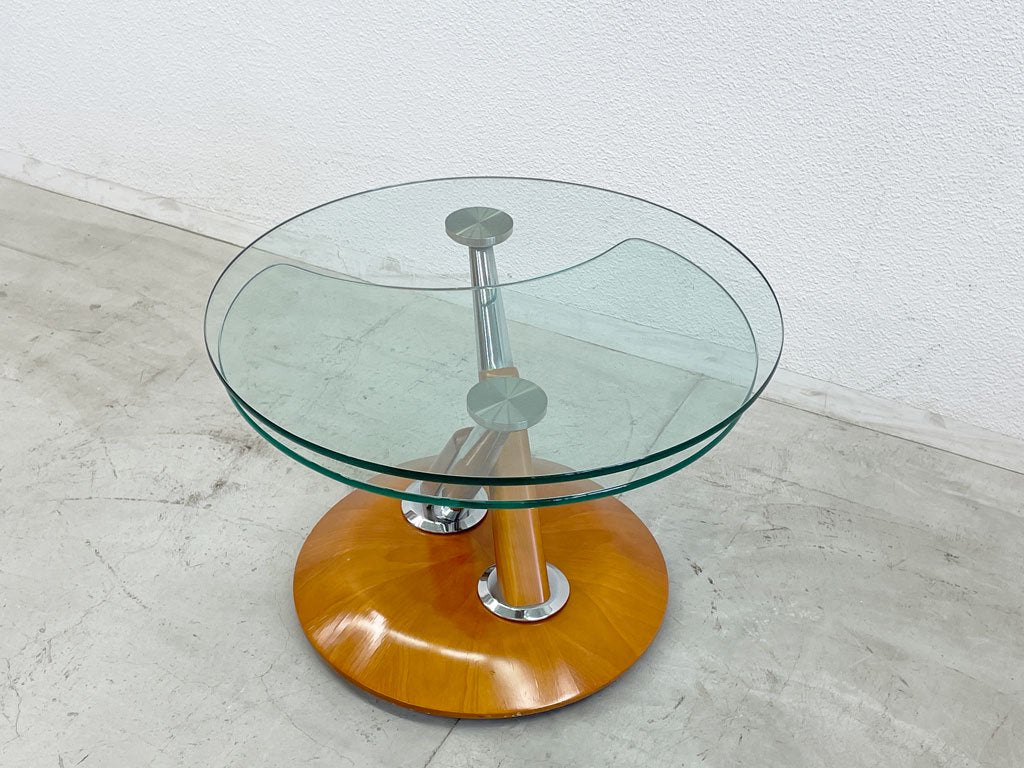畳んでいる時は直径約70cmのラウンド型ですが可動させることで下にある天板が顔を出し、2枚のガラス天板を擁するテーブルとなるギミックを搭載しています。