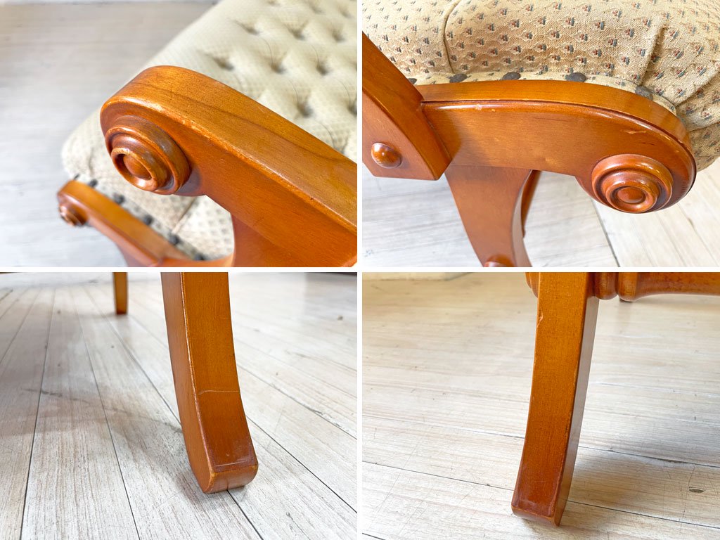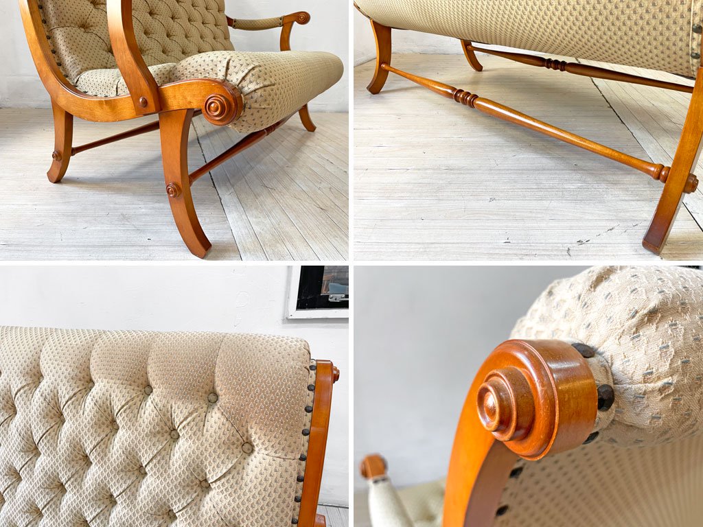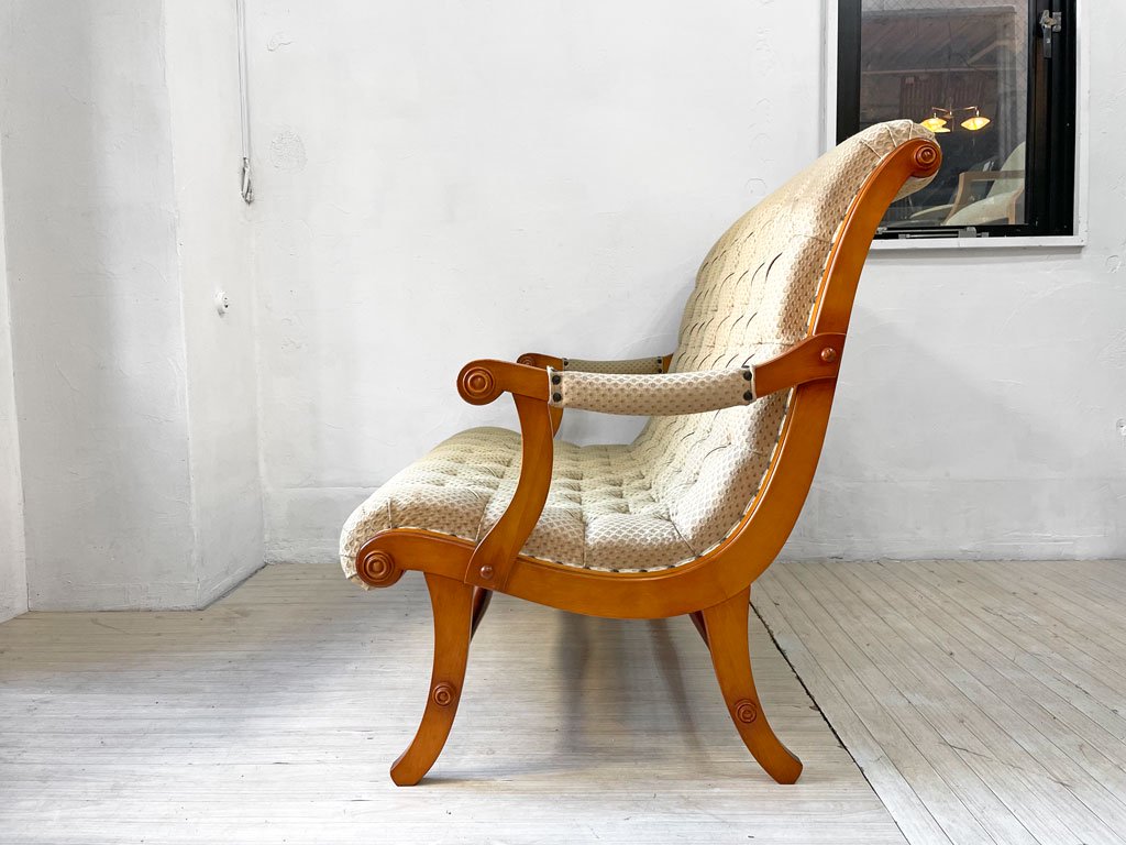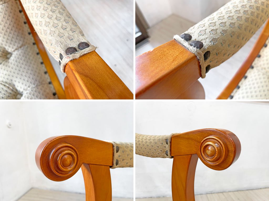 背もたれのボタン留めやスタッズ、カールしたアームのデザインに施された彫りといった控えめながらエレガントな装飾は、横浜ダニエルならではの優雅な佇まい。
