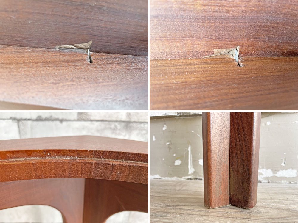こちらは、ビンテージのお品物です。使用や経年に伴い、チーク材フレームには若干の傷やスレ、打痕傷等がございます。またフレームの裏には金具で留める際にできた大きな削れがございますが、普段は見えない箇所の為、さほど気にならないと思われます。その他、ガラス天板には傷や汚れが散見されるとともに、縁には僅かなチップが確認できます。
