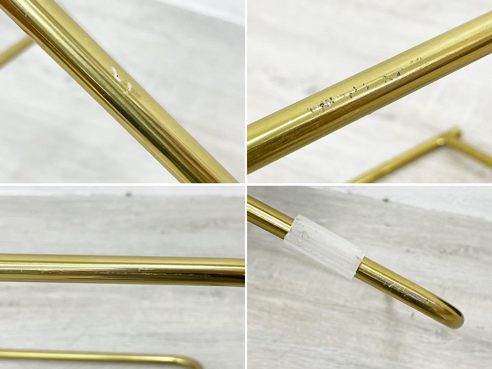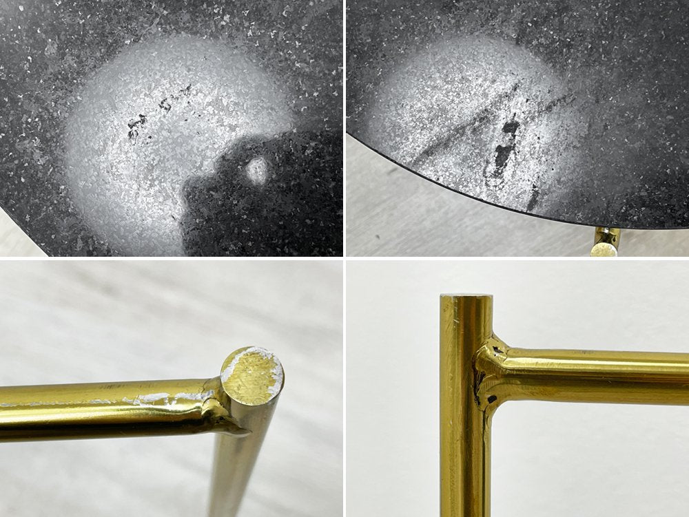 使用に伴い大理石天板に擦れ傷やそれによるくすみ、脚部に小傷やペイントロスなどが見受けられます。また、天板用の滑り止めクッションが欠品しているものの、ガタツキなど通常使用には問題ございません。気になる方は別途お取り付けをお願い致します。