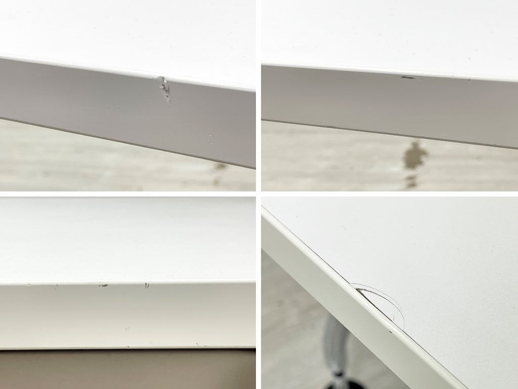 傷や汚れに強いメラミン天板のホワイトと、ポリッシュクローム仕上げが施された強靭なスチールパイプ脚の組み合わせが、スタイリッシュな空間にマッチします。
