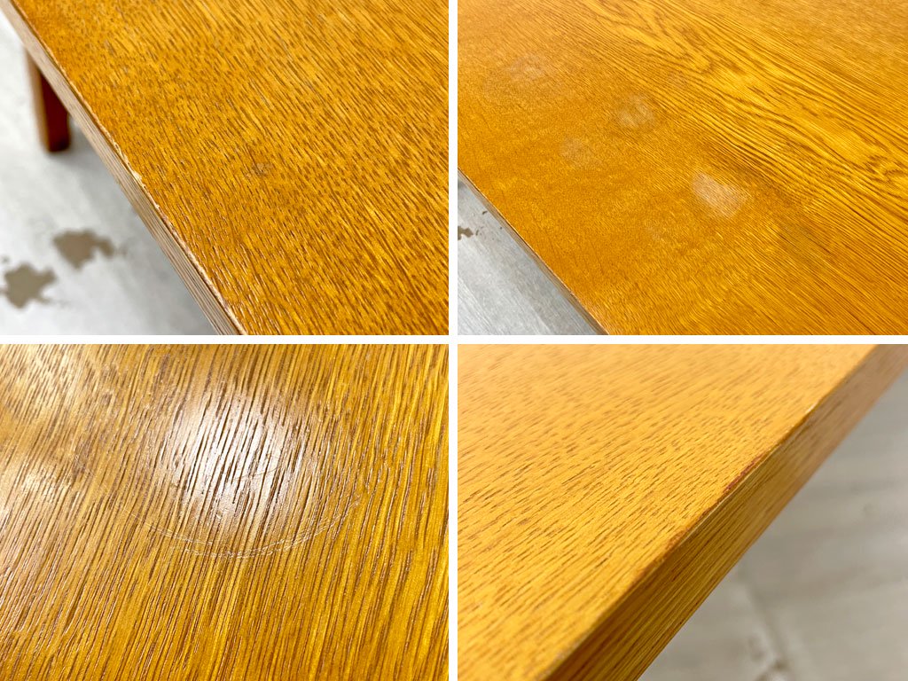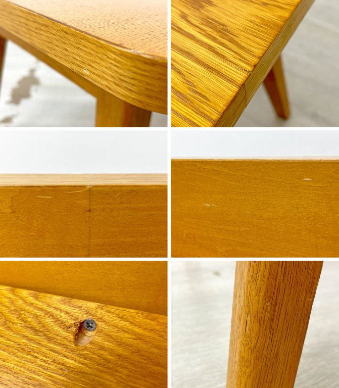 使用に伴う小さな擦れや傷、打痕、天板の縁には僅かに突板の剥がれが散見されます。また、天面の中央付近にはシミによるウレタン塗装の劣化が見られ、それに伴い色抜けが生じている部分が数箇所ございます。多少の使用感はございますが、ご使用に問題となるダメージはございません。これからもまだまだ実用いただけるコンディションを保っております。