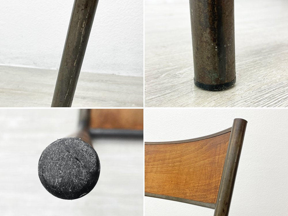 こちらはビンテージのお品物です。経年・使用に伴い背座にプライウッドの劣化による細かなヒビ、黒ずみや染み、脚部に擦れ傷、金属特有のくすみや錆びなどが見受けられます。