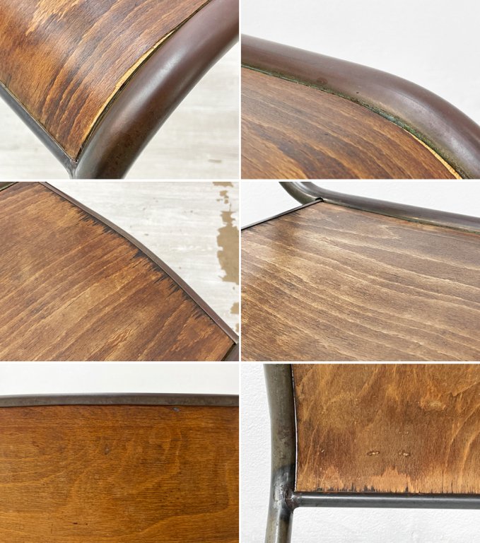 また、脚裏のゴムに一箇所割れが確認できる他、プライウッドの背座とメタルフレームの間、プライウッドの積層の間にそれぞれ僅かな隙間が生じていることにより、着座の際に若干の軋み音が聞こえる場合がございますが、現状強度的な問題はございません。