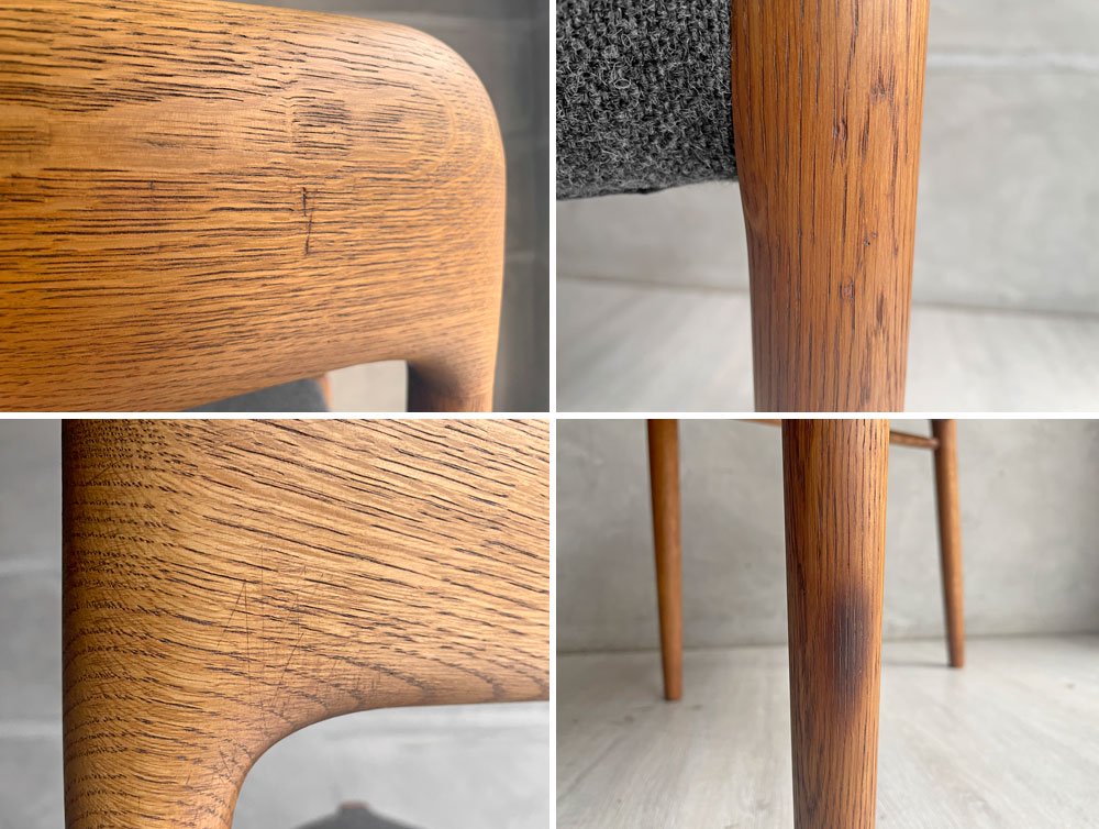 当店入荷後にフレームのサンディングとオスモワックスの塗布、座面の総張り替えを行っております。細かな打痕や擦り傷は見られるものの、極端に美観を損なうようなダメージはなく、これからも長くお使い頂けるコンディションとなります。