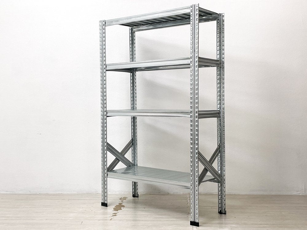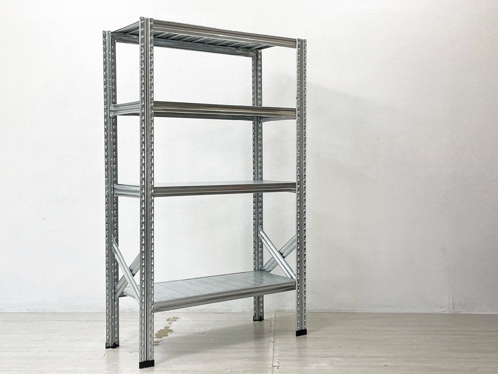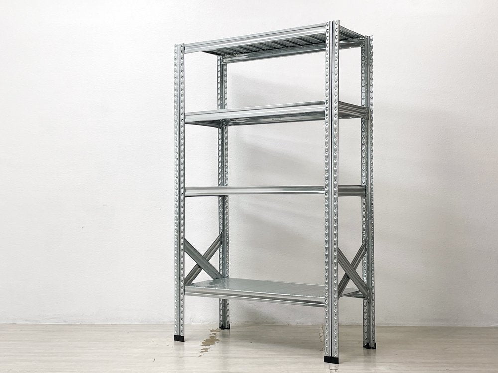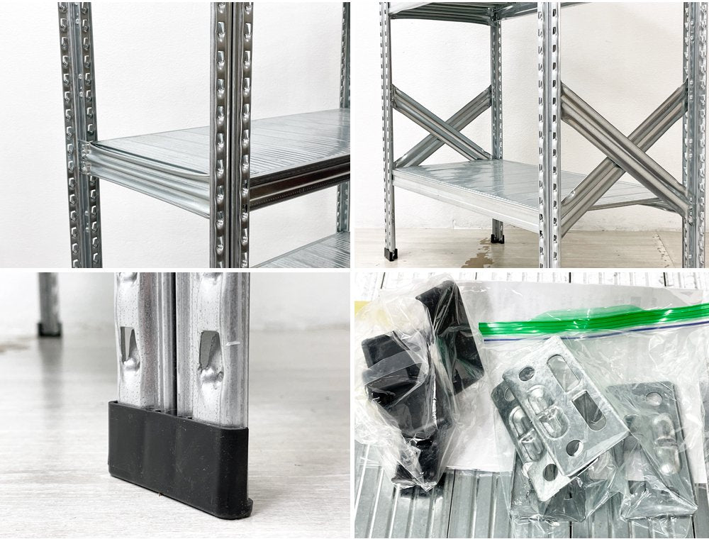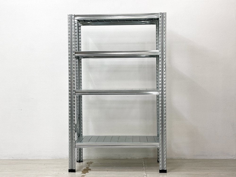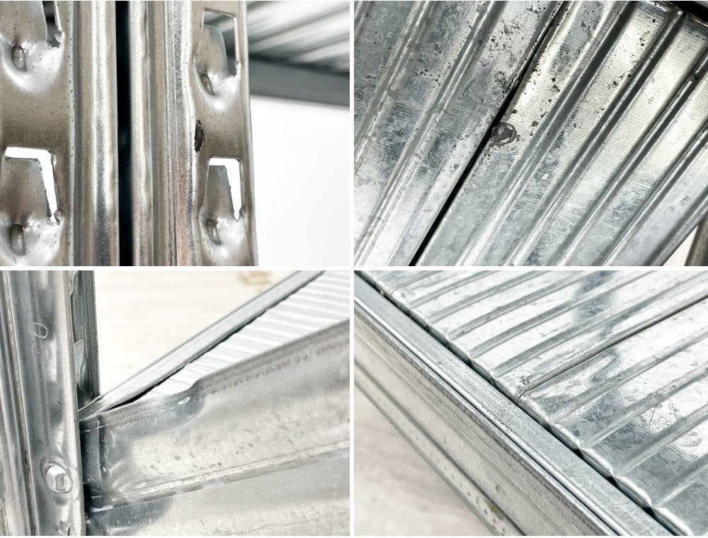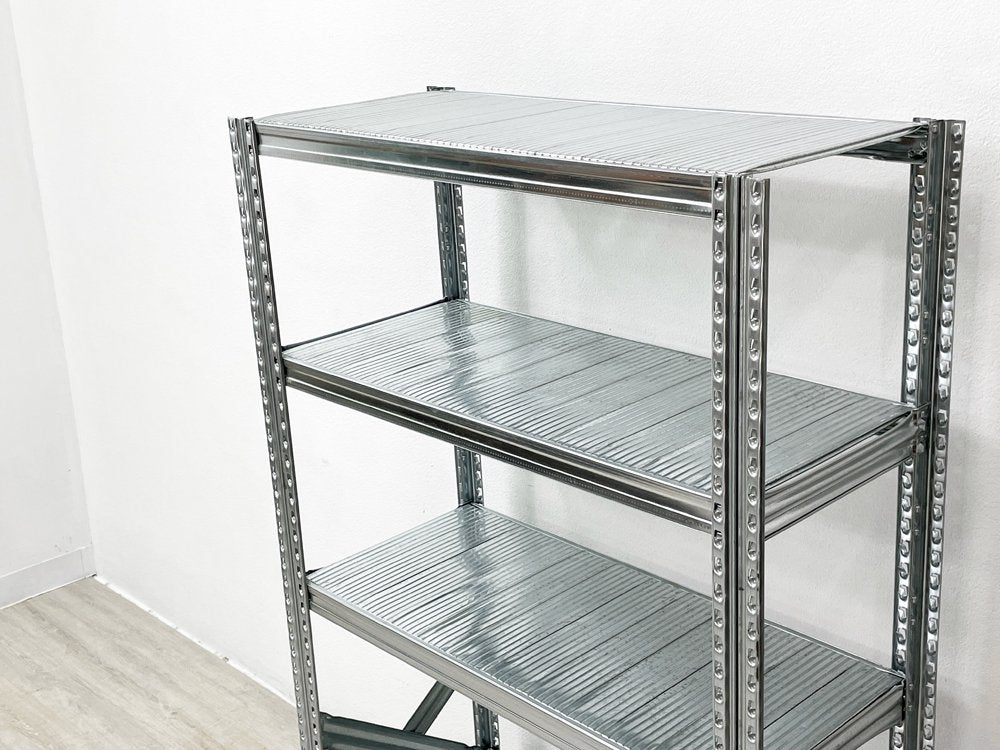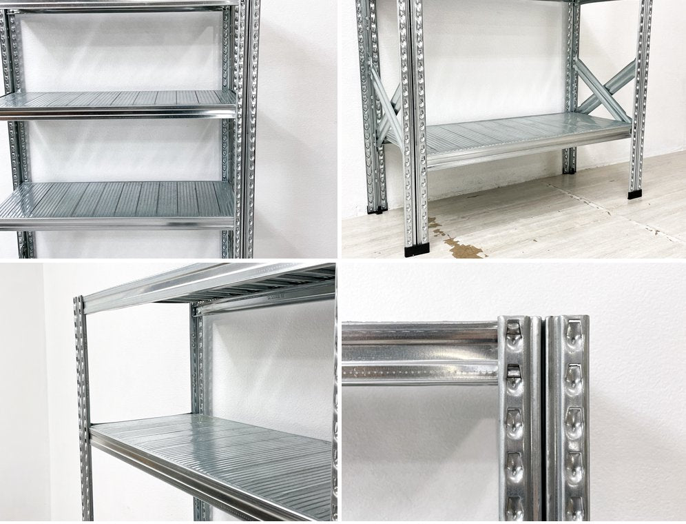 最大の特長は、ボルトを使わず棚板を支える独自のリブ構造。その耐荷重は1枚あたり150kgともいわれます。