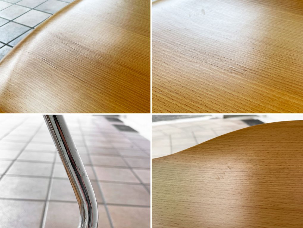 使用に伴いシートに細かな打痕や擦れ、また座面には僅かに突板には手で触れると僅かに感じる程度の浮きがございますが、気になるものではございません。また、脚には僅かに錆とくすみがございますがこちらも目立つものではございません。その他使用上問題となるガタツキ等も無く、概ね良好なコンディションを保っております。