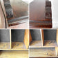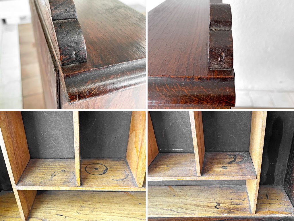 天板を開いた内部には書斎に必要な筆記具や小物類を収められるシェルフが備えられており、その下には2段のオープンシェルフが設けられておりますので、実際に収納棚としてお役立て頂く事は勿論、その趣深い風合いを活かしたディスプレイラックとしてもお勧めです。