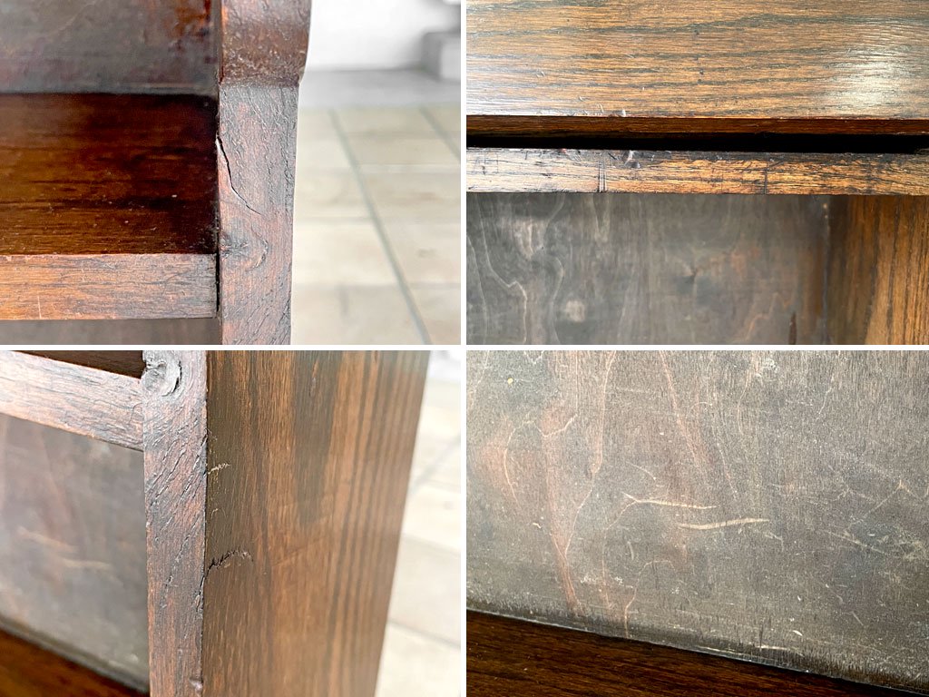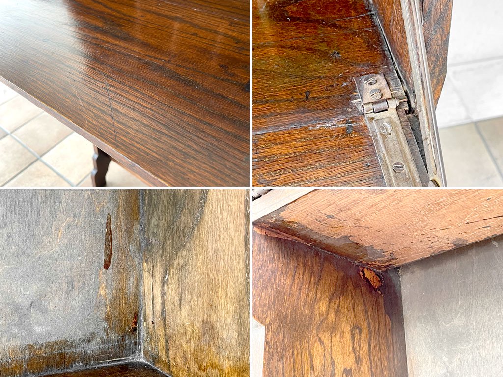 こちらはビンテージ品です。使用に伴う傷、打痕、取り切れない汚れ、塗装の剥がれ、収納部には輪染みが御座います。また経年による木材の僅かな割れも確認できますが、どれも外観を大きく損ねるものでは御座いません。使用に問題となるようなガタツキは無く、フラップ天板の蝶番部等基本的な可動部はimptionにてメンテナンスを行っておりますので、今後も問題なくお使い頂けるコンディションとなっております。