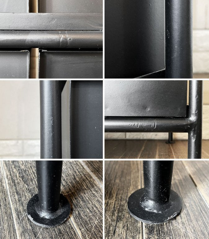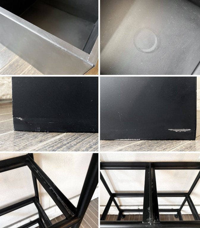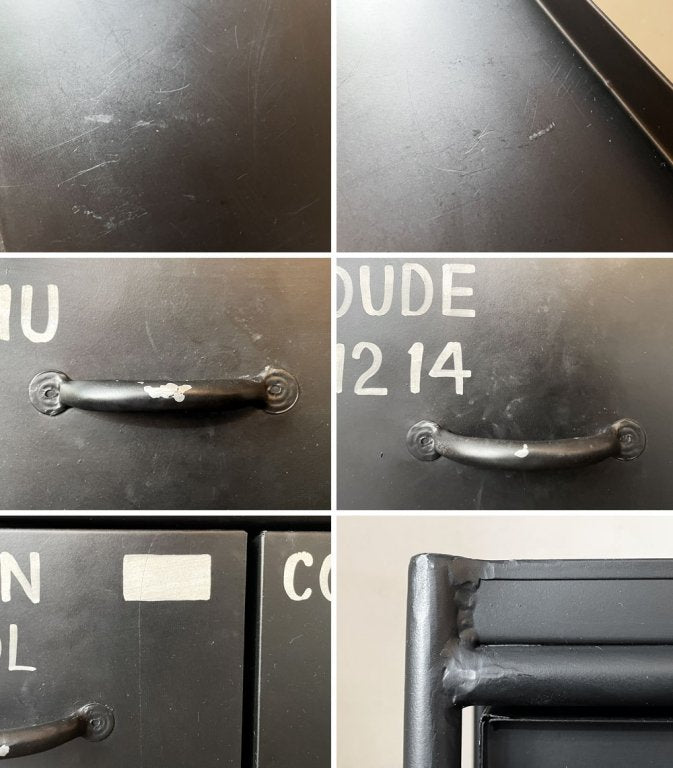 全体に擦れや傷、塗装の剥がれ、抽斗の若干の歪みや凹み、錆や白っぽい汚れ等が見受けられます。また、随所に溶接痕が確認できるほか、背面裏のフレームの一部にシール痕がございます。やや使用感はございますが、ご使用に支障となるダメージはございません。インダストリアルの風合いをお楽しみいただきながら、これからも実用頂けます。