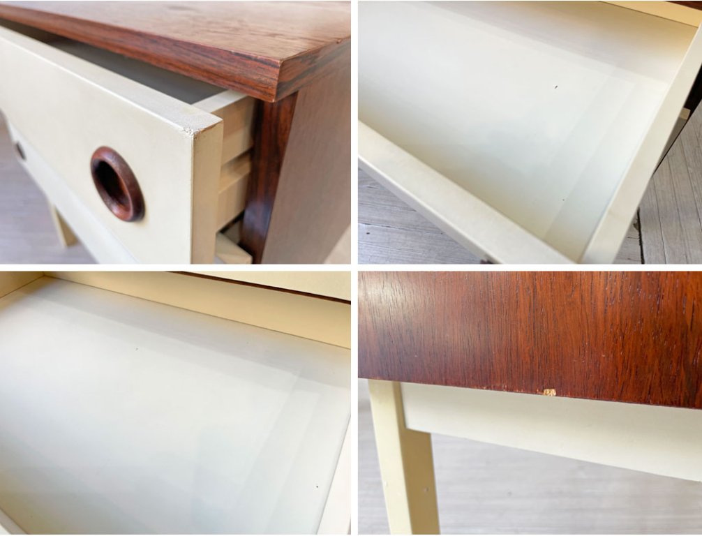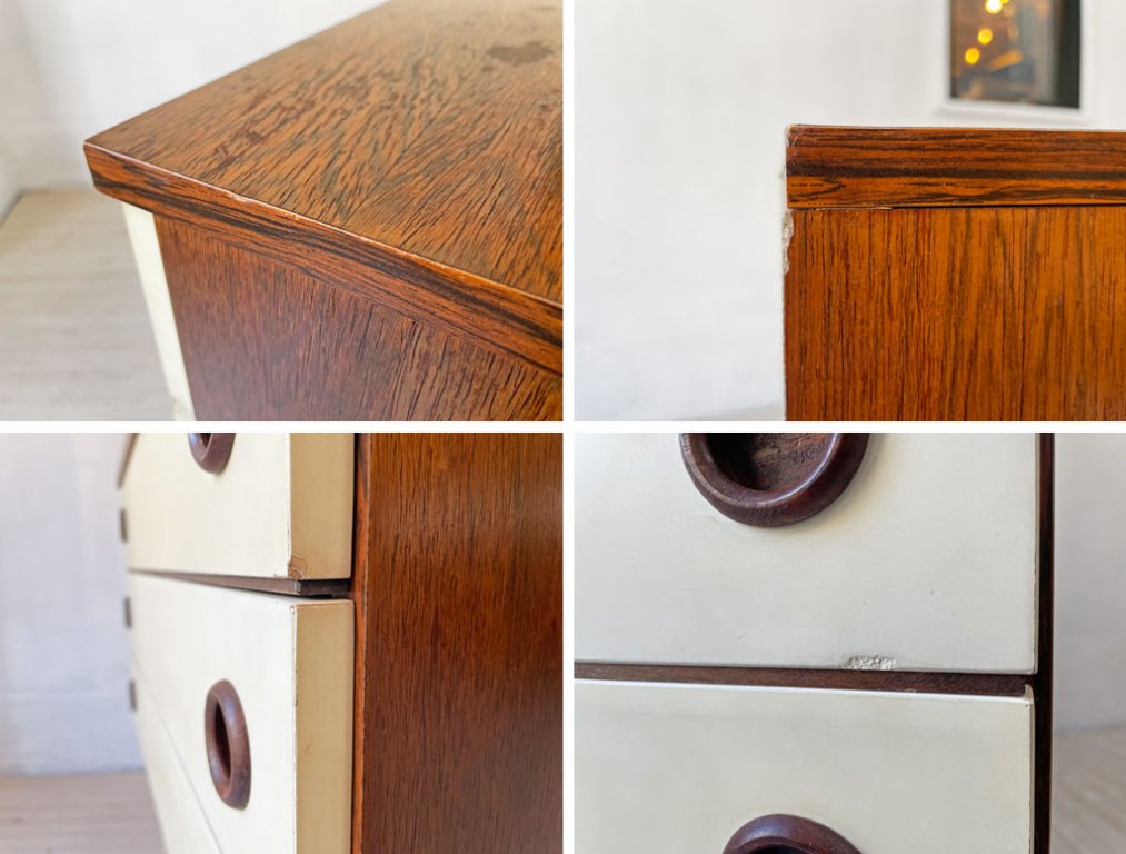 天板と側板には杢目・色味の美しい希少なローズウッド材、ドロワー前面にはレトロで可愛らしいメラミン材を使用した可愛らしいサイズのミニチェスト。