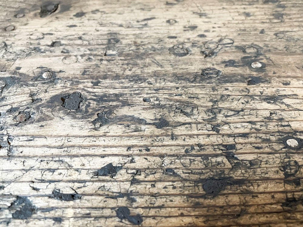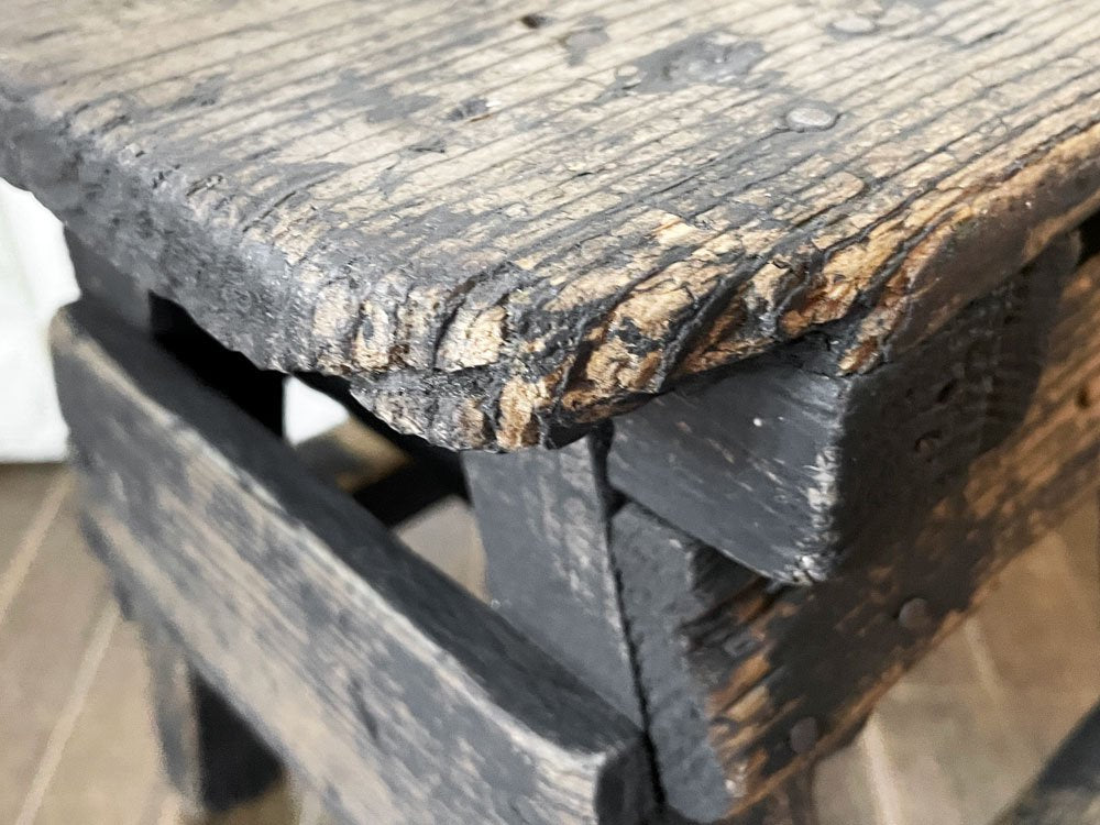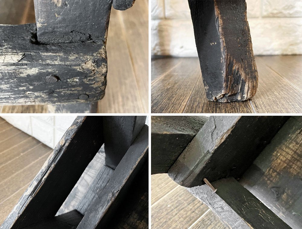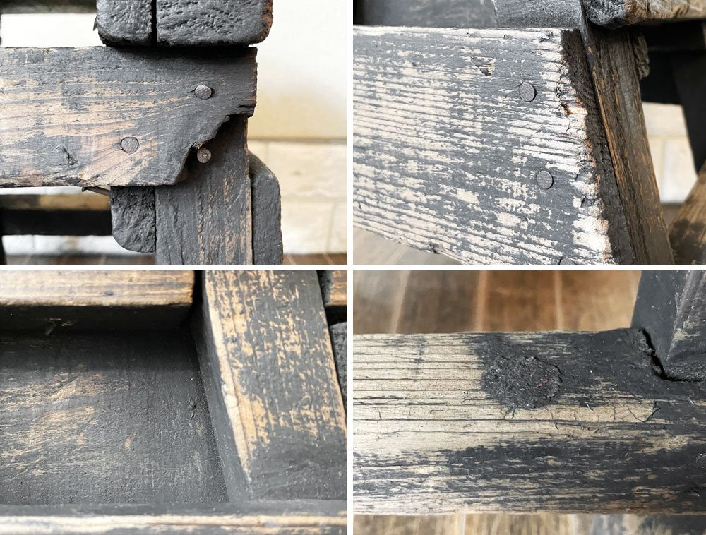 こちらは、ビンテージのお品物です。全体に擦れや傷、縁の削れや木部の割れや欠け、亀裂などが散見されます。また、一部釘が飛び出している箇所が確認できるとともに、黒い塗装の色移りが生じますので、ご使用の際はご注意くださいませ。その他、がたつきやぐらつきといったご使用に支障となるダメージはございません。風合いをお楽しみいただきながら、これからも実用頂けます。