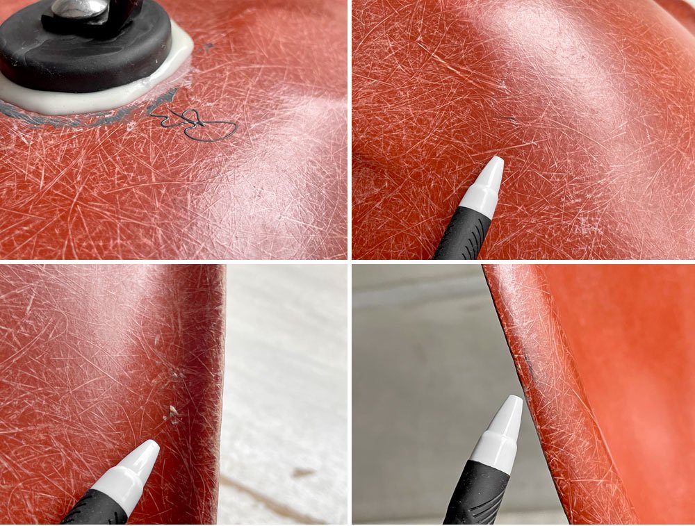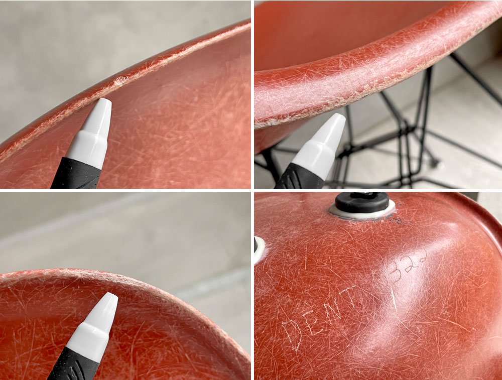 こちらはビンテージのお品物です。使用・経年に伴いシェルには小傷や擦れによるペイントロスが主に縁に見受けられます。またシェルの座面裏面に文字が手彫りされております。経年なりの使用感はあるものの、ベース・マウント部分共に修理を行いこれからも永く実用頂けるコンディションを保っております。