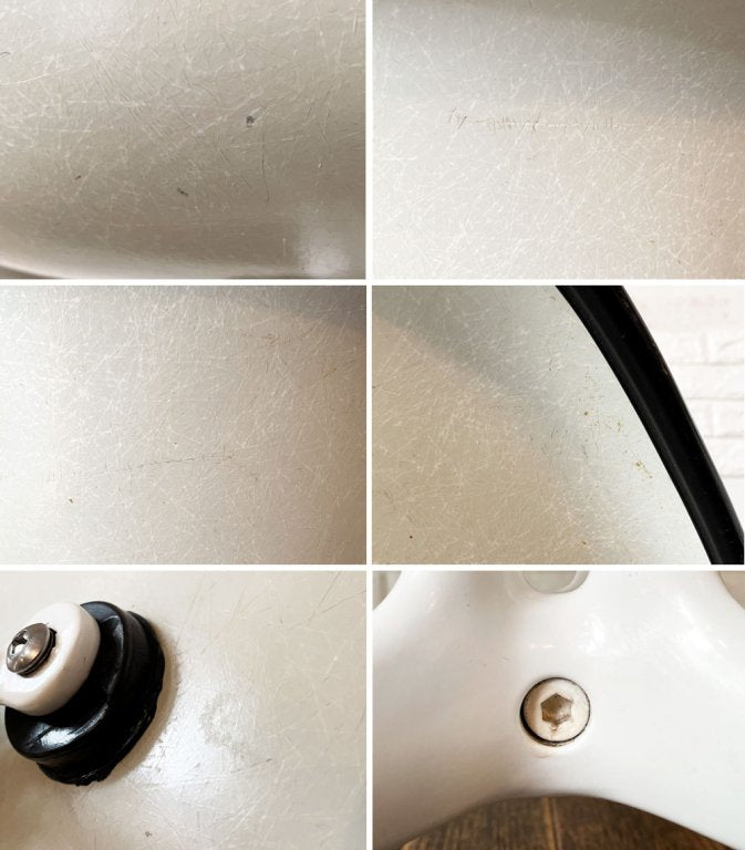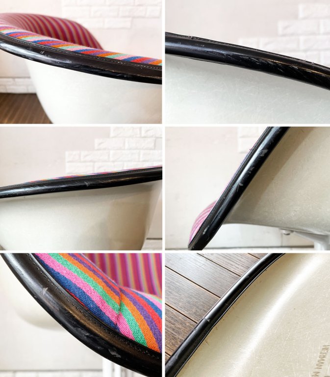 こちらは、ビンテージのお品物です。シェルには一部目立ったガリ傷が見受けられるほか、経年による傷や擦れ、黒ずみや黄ばみ、シミ汚れ等が散見されます。また、座面の縁取り部分には多数の傷が確認できるとともに、脚部には脚底を中心にペイントロスがございます。その他、ファブリックの若干の毛玉や毛羽立ち等はございますが、ご使用に支障となるダメージはございません。これからもミッドセンチュリーの風合いをお楽しみいただきながら、気持ちよく実用頂けます。