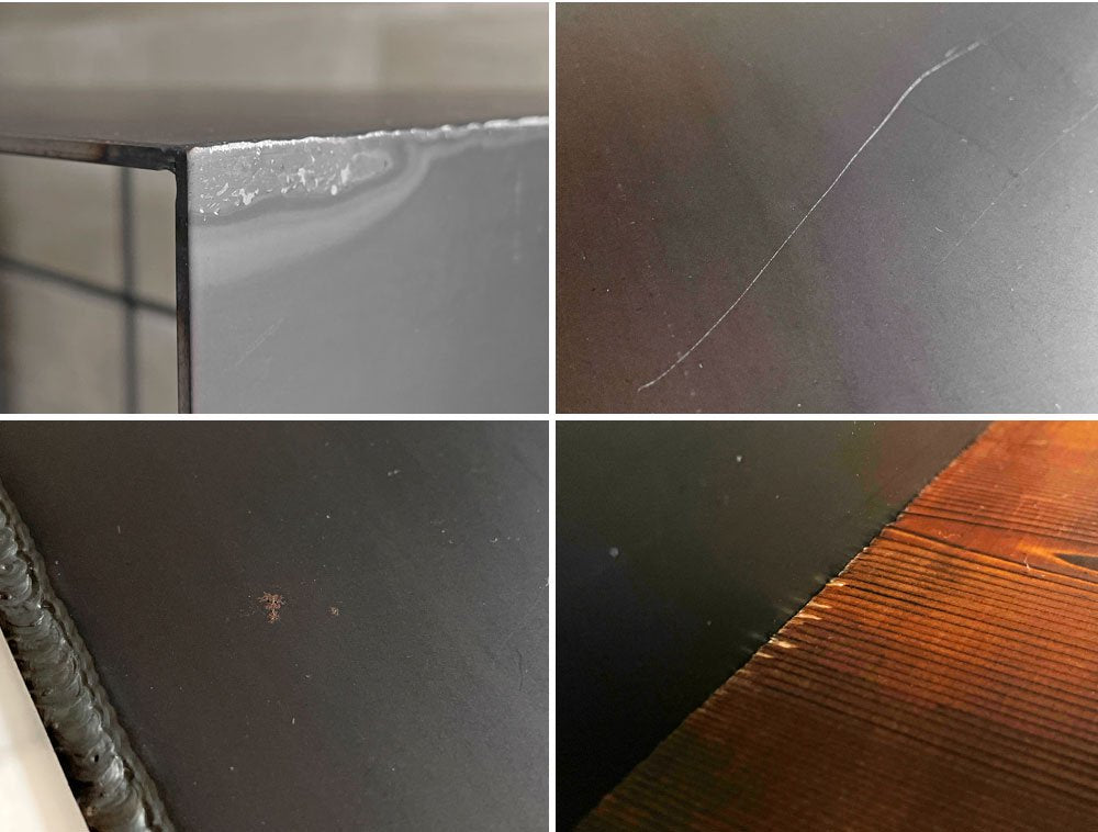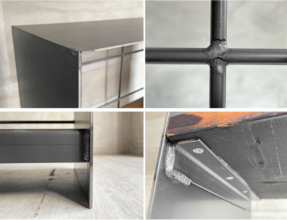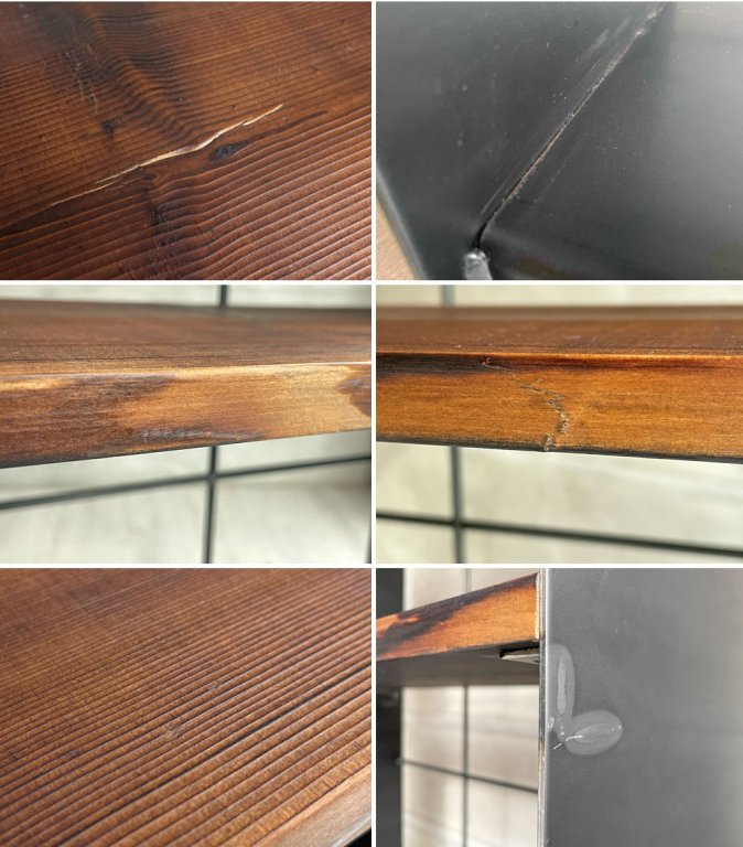 使用に伴いフレームには複数の擦れ傷、ペイントロス、製造上の特性による溶接の跡や色味のムラがございます。棚板には擦れや打痕、縁の表面に一箇所僅かなヒビが見受けられますが、その他ご使用に問題となるダメージは無く、今後とも雰囲気を楽しみながらお使い頂けるコンディションを保っております。