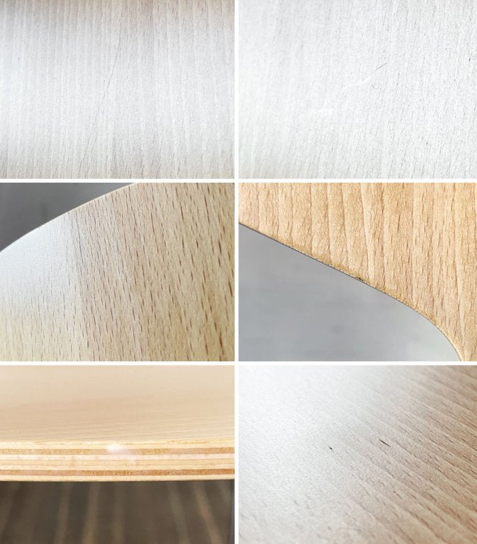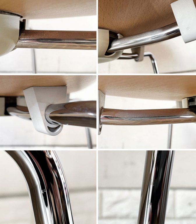 使用に伴う擦れや傷、取り切れない汚れのほか、脚部の座面下に近い部分を中心にくすみが生じております。いずれも著しく美観を損ねる大きなダメージではございません。ご使用に支障となるがたつきやぐらつきはなく、これからも安心して実用頂けます。