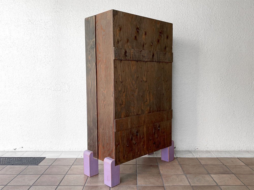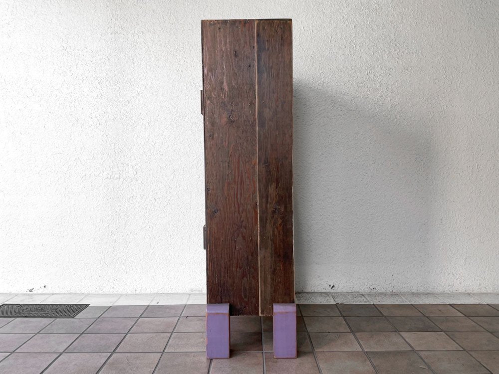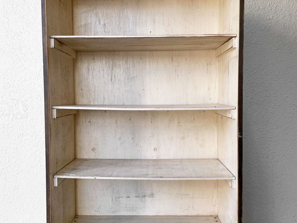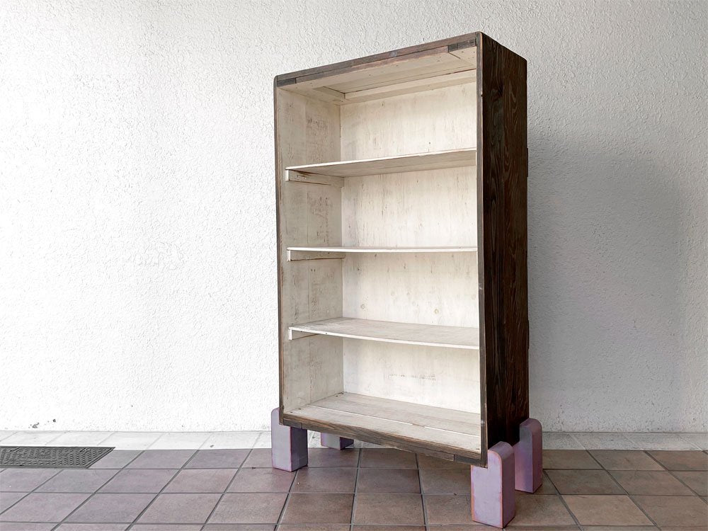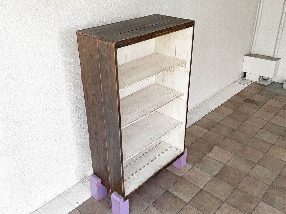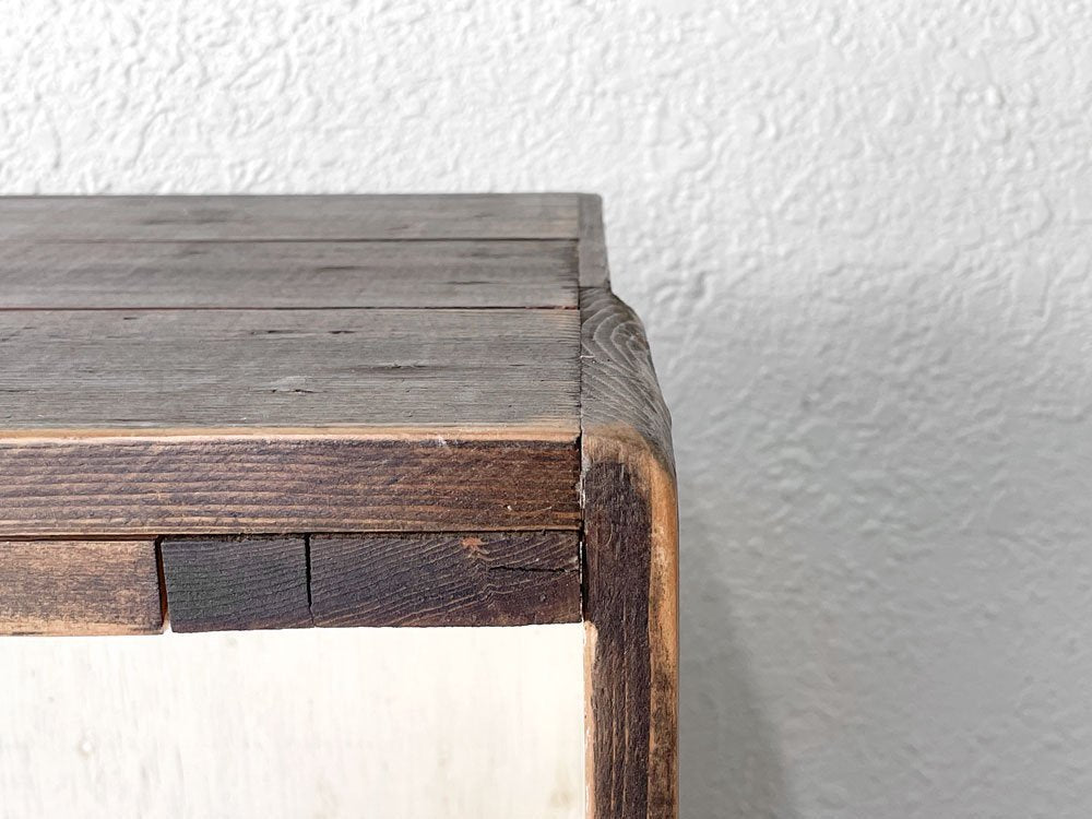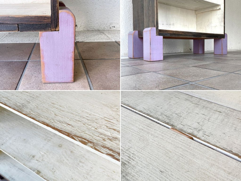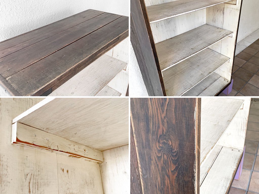 こちらは古材を使用した品物です。材特有の傷や凹凸がございますが、味としてお楽しみ頂けます。その他使用に伴う擦れやペイントロスも散見されますが、商品の雰囲気とよく馴染んでおり目立つものではございません。僅かに棚板のたわみがございますが、その他ガタツキや割れ等大きなダメージも見受けられず、概ね良好なコンディションを保っております。