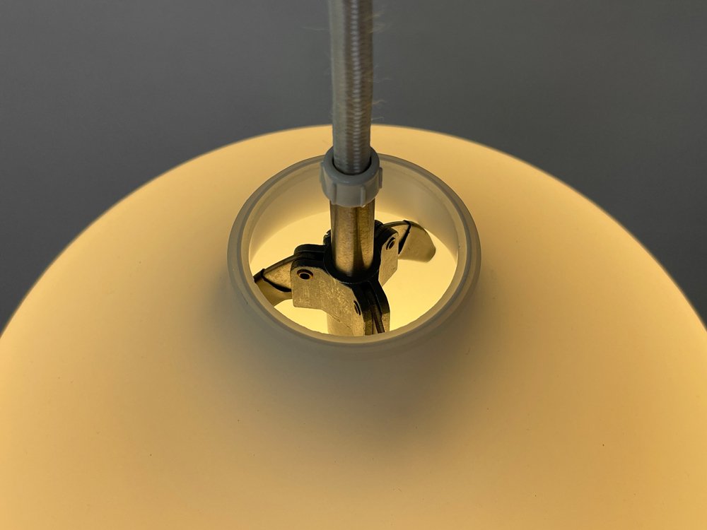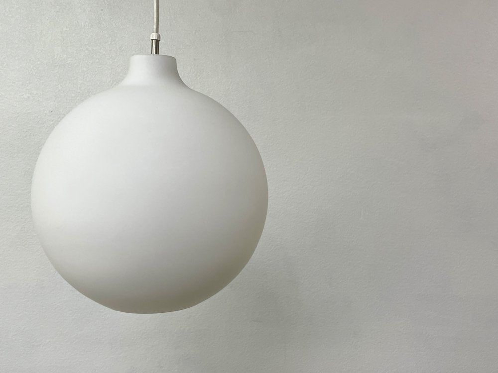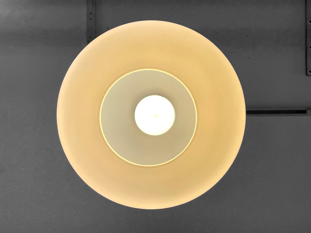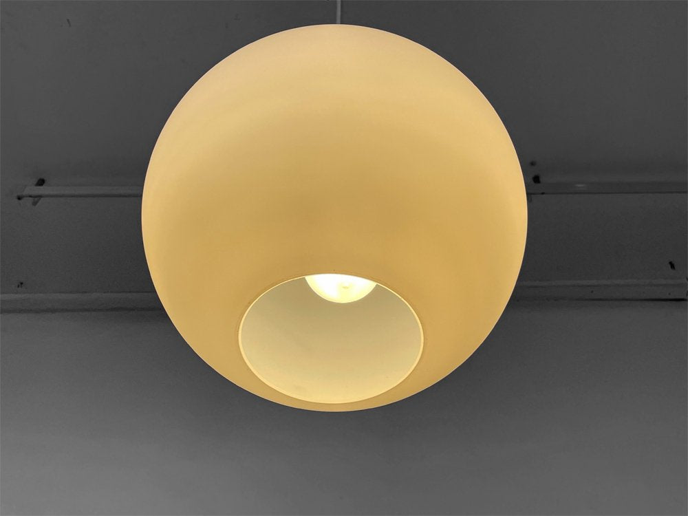 シェードは余計な装飾はなく、シンプルに丸く宙吹き成型されたようにみえますが、断面を観察すると3層の色が異なるガラスによって構成されており、また表面はマットに仕上げられております。故に普通のクリアガラスや白いガラスとは異なり、温かみがありながらも明るすぎず、広範囲に届く光が生まれます。