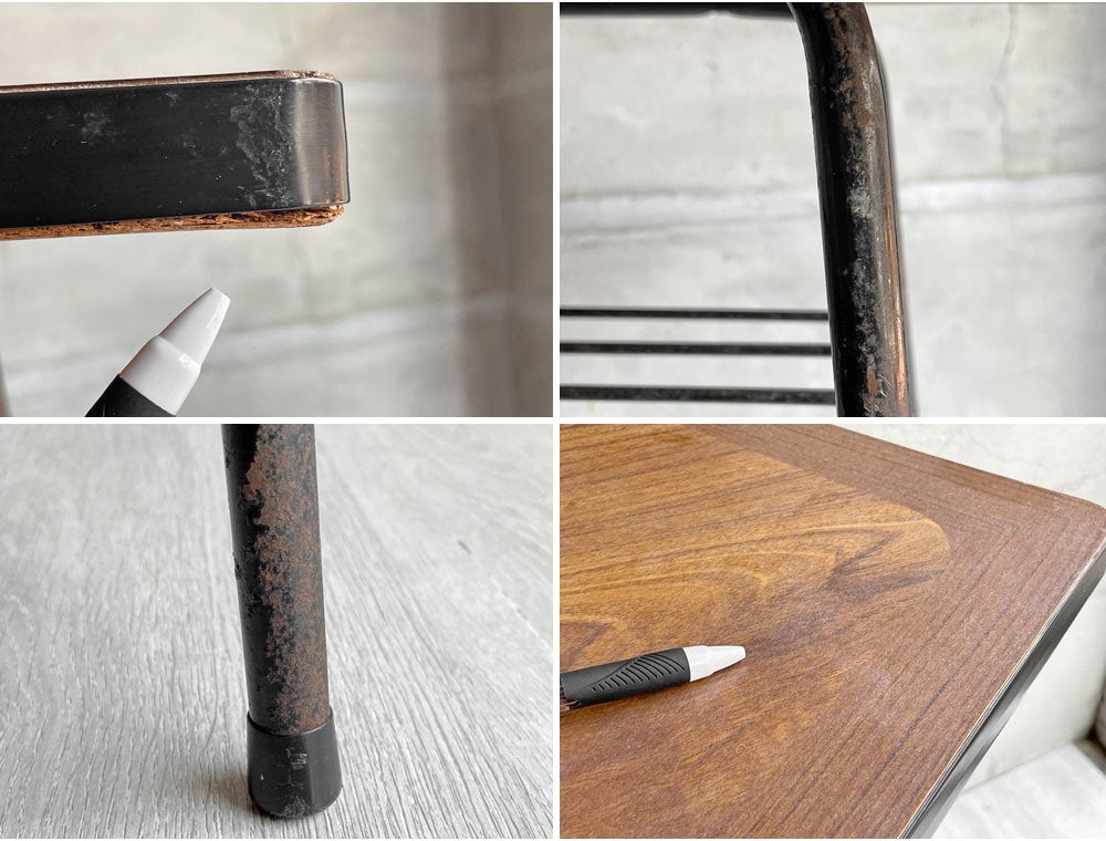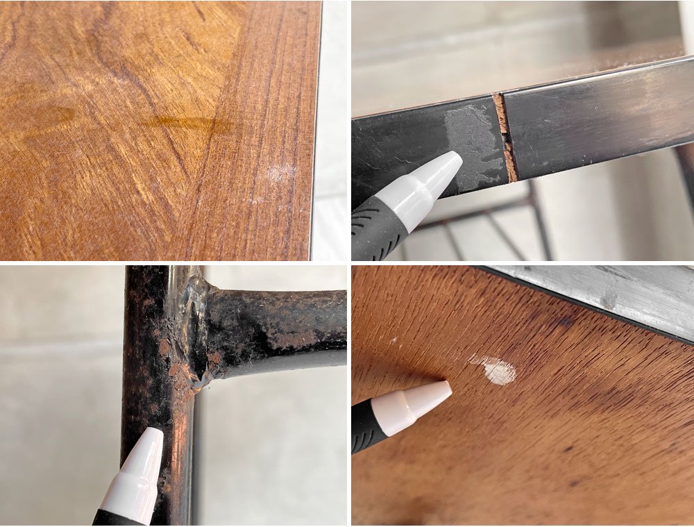 こちらはビンテージのお品物です。使用・経年に伴い、天板表面には擦れや線傷、くすみなどが散見されます。また天板の脚部にはサビや塗装の剥がれが見られます。使用感はあるもののビンテージの風合いとしてお楽しみ頂けるコンディションを保っております。