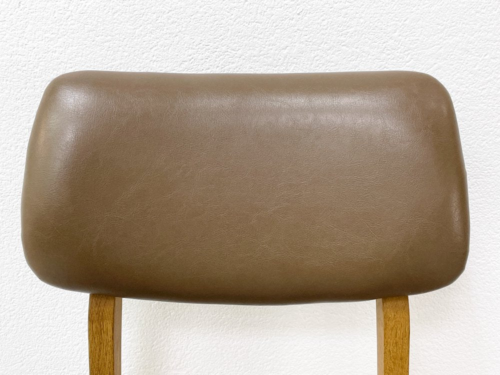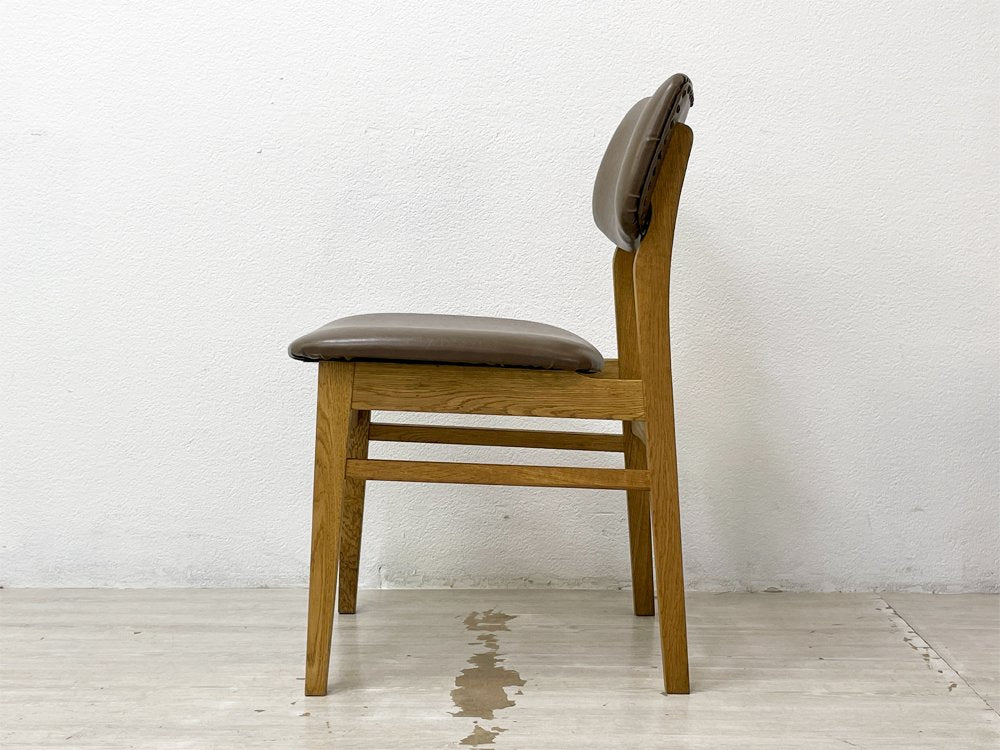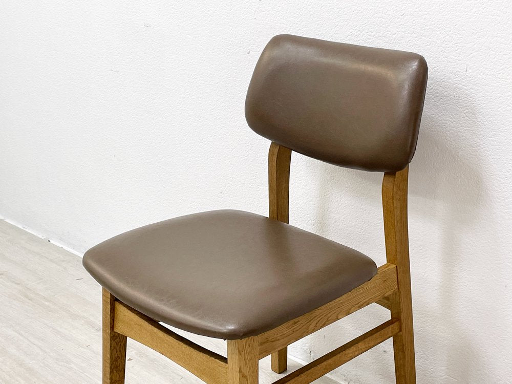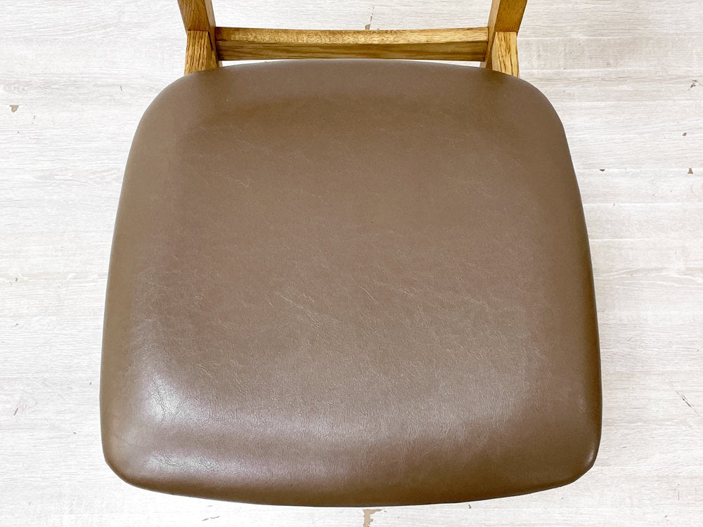 こちらは同社の人気シリーズ『 パッドチェア / PAD CHAIR 』になります。ナチュラル感を感じられる木の節を残したオーク無垢材フレームを使用。背座のクッションにはお手入れが容易なPVCレザーを使用し、統一感のある色合いが心地よいダイニング空間を演出してくれます。背もたれの後ろにはアンティークゴールド色の鋲打が施され、美しいバックスタイルが目に留まります。