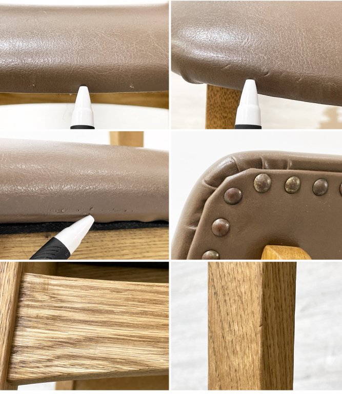 使用に伴いPVCレザーの背座面に小さな傷が散見される他、フレームに擦れや僅かな色ムラ、打痕などがございます。また、鋲留めのパーツに錆びやくすみが生じておりますが、風合いとしてお楽しみ下さいませ。