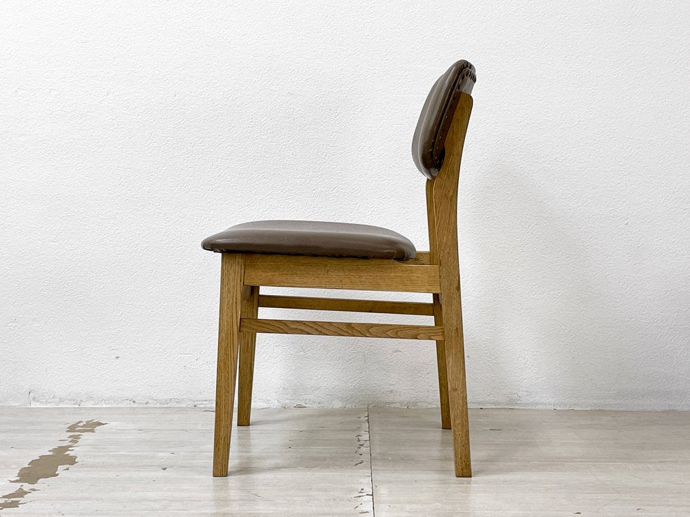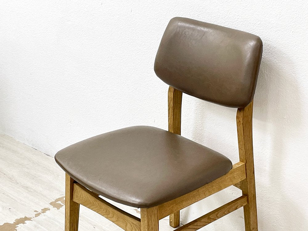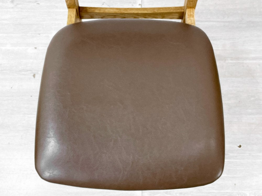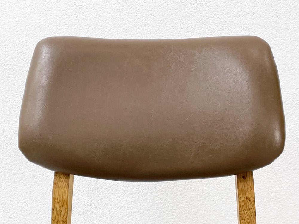 こちらは同社の人気シリーズ『 パッドチェア / PAD CHAIR 』になります。ナチュラル感を感じられる木の節を残したオーク無垢材フレームを使用。背座のクッションにはお手入れが容易なPVCレザーを使用し、統一感のある色合いが心地よいダイニング空間を演出してくれます。背もたれの後ろにはアンティークゴールド色の鋲打が施され、美しいバックスタイルが目に留まります。