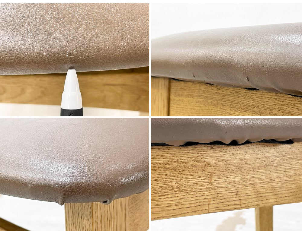 使用に伴いPVCレザーの背座面に小さな傷が散見される他、フレームに擦れや僅かな色ムラ、取りきれない染み・汚れ、打痕などがございます。また、鋲留めのパーツに錆びやくすみが生じておりますが、風合いとしてお楽しみ下さいませ。