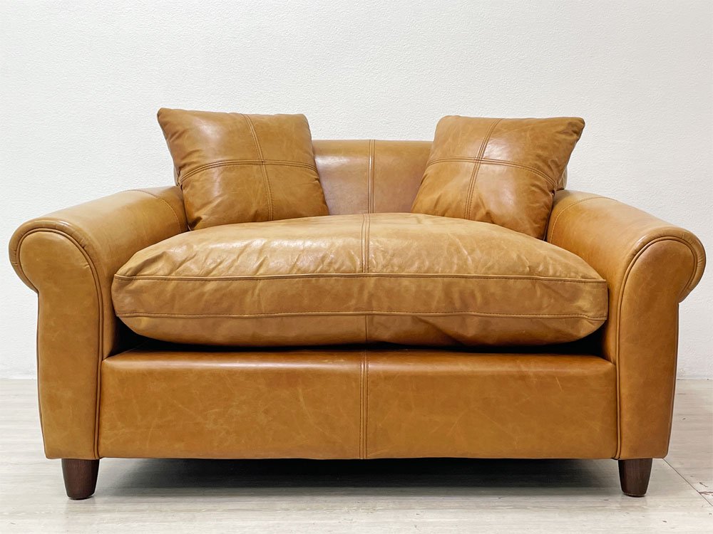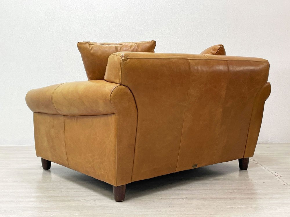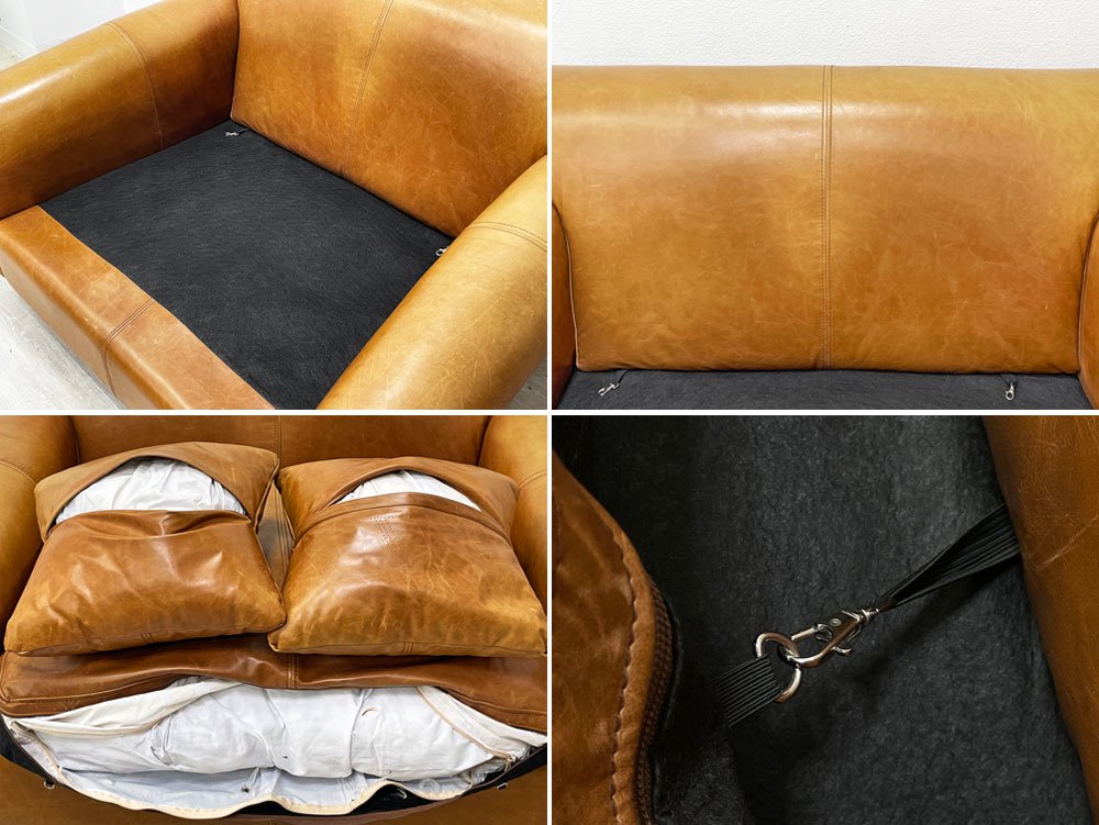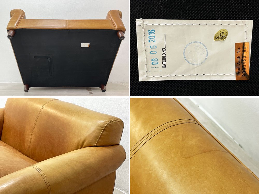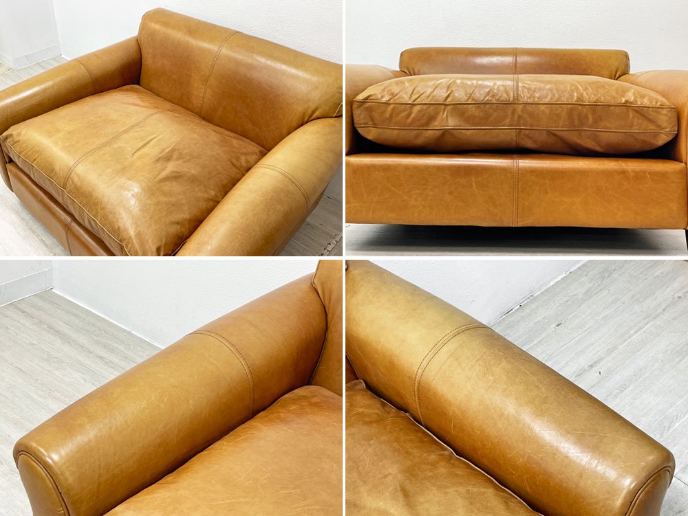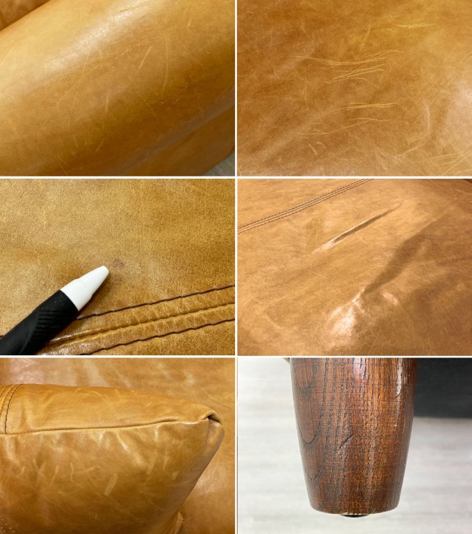 使用に伴いレザー部に擦れやスクラッチ傷、薄染み、日焼けによる色褪せ・ムラなどが見受けられます。また座面中央付近には僅かな型崩れが生じておりますが、座り心地に然程影響は感じられません。フェザークッションならではの空気感ある座り心地は健在で、これからもレザーの風合いをお楽しみ頂きながら、実用頂ける概ね良好なコンディションを保っております。