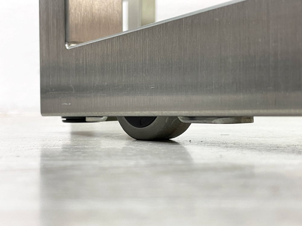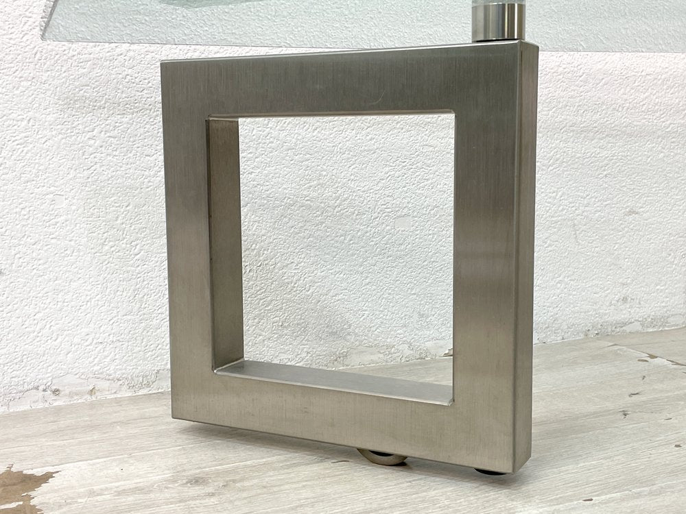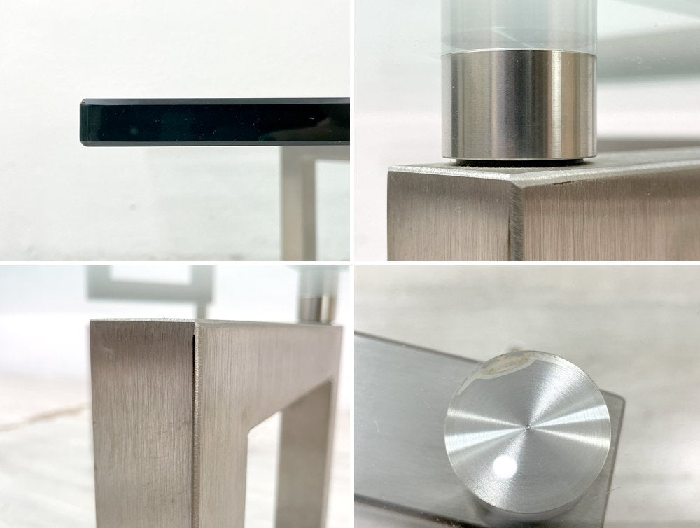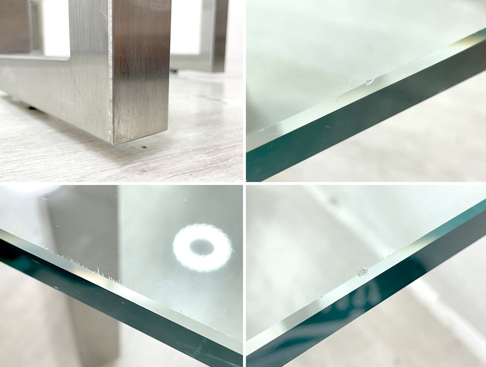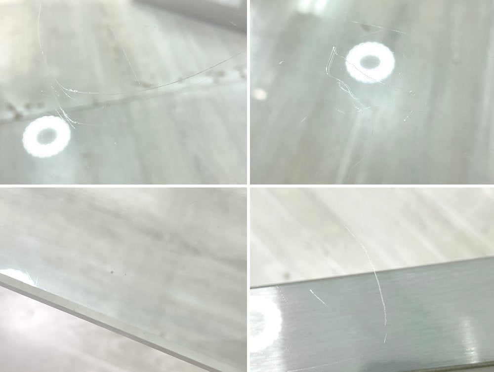 使用に伴い、ガラス天板の表面にやや目立つ線傷が散見され、縁の数箇所に小さなチップが見られます。脚部は素材特有のくすみや落としきれない汚れがあるものの、キャスターの動作に問題は見られず、これからも実用いただけるコンディションを保っております。