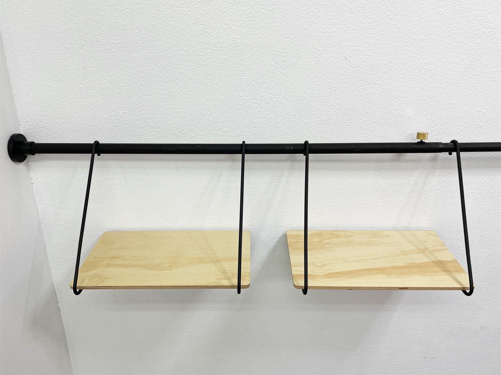 天板は突っ張り棒にひっかけて壁に設置するため、特別な工具も必要とせず、従来のウォールシェルフのように壁に穴をあける必要もありません。横幅約115~190cmで伸長可能です。