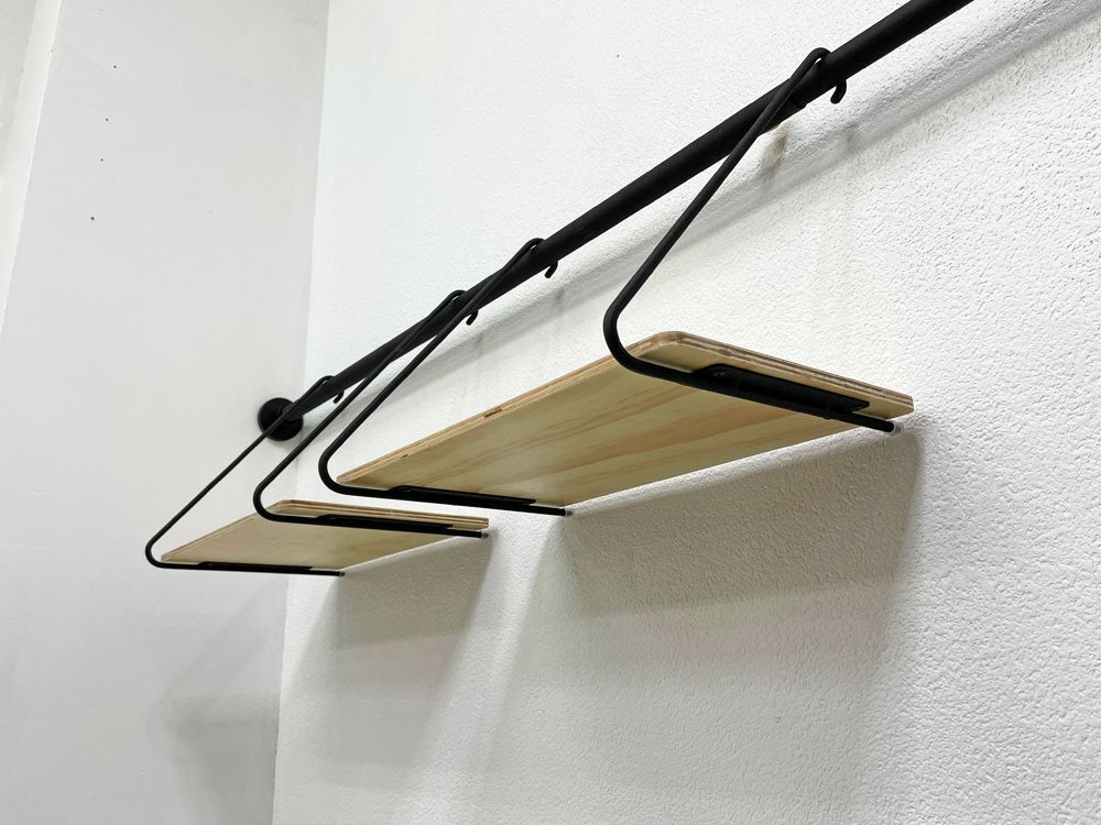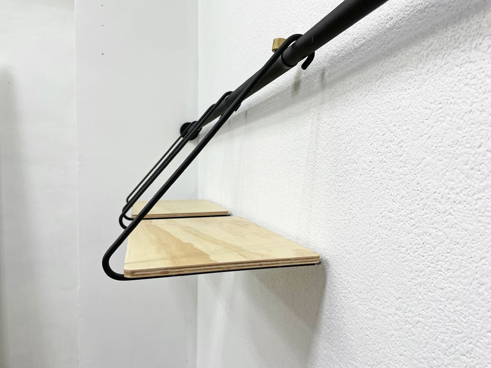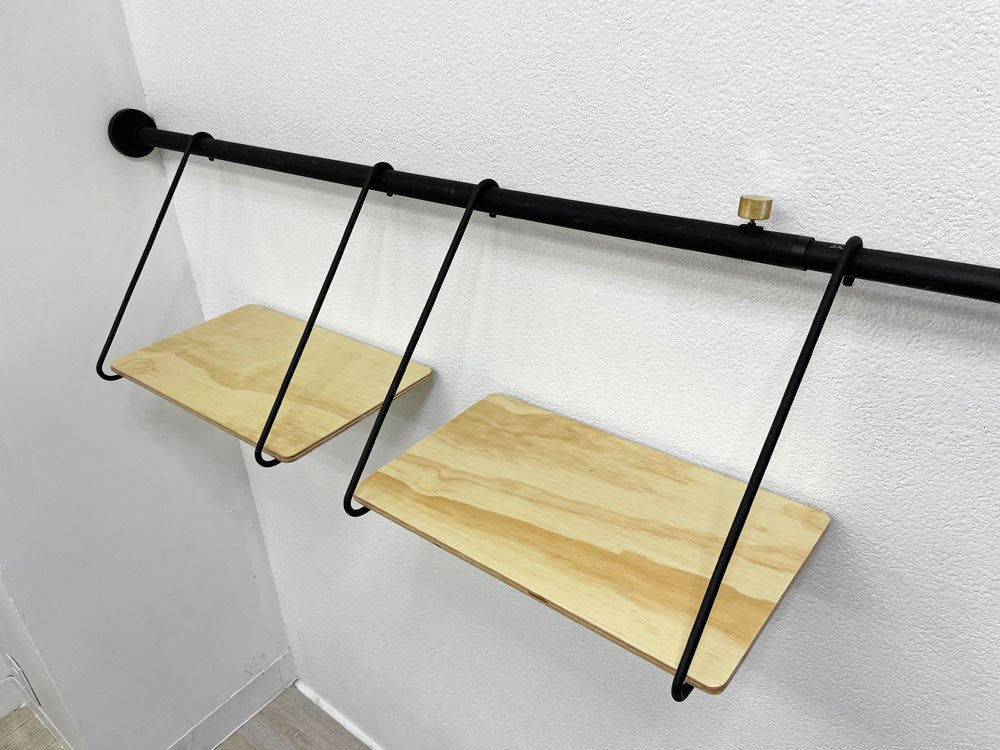 サイズやオプション等、幅広いバリエーションで展開する人気シリーズですが、こちらはテンションロッドを横向きに使用し、温かみあるナチュラル色の天然木天板を組み合わせるウォールシェルフセット。